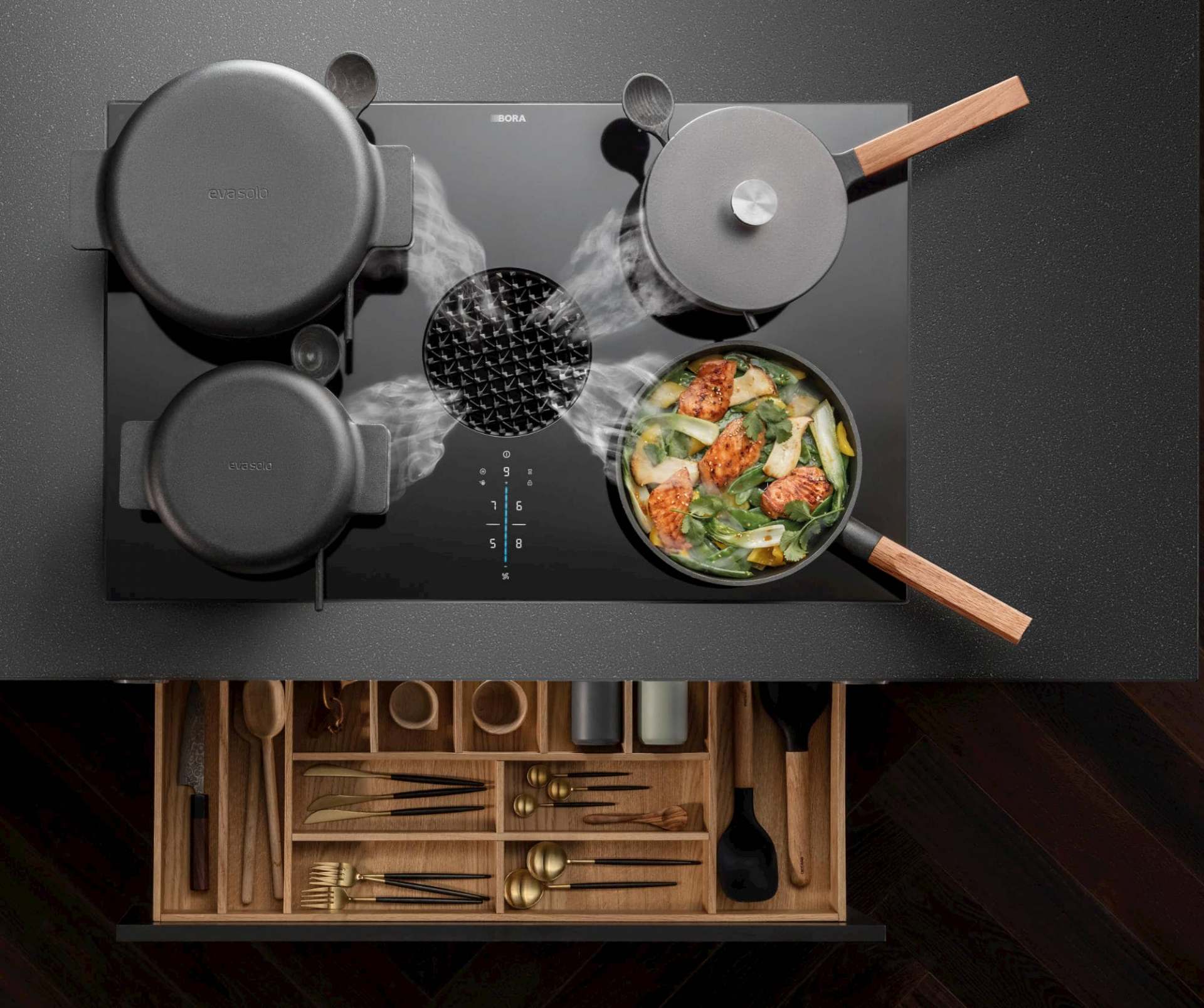 Der neue Bora X Pure Muldenlüfter lässt sich zurückhaltend und elegant in jede Küchenarchitektur integrieren. Die Einströmdüse mit markantem Design ist leicht vertieft in der Mittel des Kochfelds eingesetzt und erzeugt durch Verdrehen unterschiedliche Optiken. Der Filterwechsel eSwap kann schnell und einfach von oben durch die Einströmöffnung erfolgen.