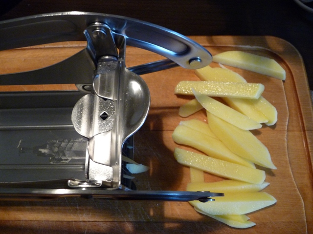 Jo, dachte ich, die Zange und die Presse mögen ja harmlos sein. Aber der Pommes Frites Schneider – der ist doch bestimmt wieder so ein Ding, den eine 1,50 m zarte Frau nicht allein ohne roten Kopf vor Anstrengung bedienen kann. Ich bin zwar keine 1,50 groß, aber ich hasse es, wenn ich mich abmühen muss mit Geräten, die mir das Kochen angeblich erleichtern sollen und mir durch ihre Unhandlichkeit und schwere Bedienbarkeit nur meine Zeit stehlen. Darunter fallen auch hantelschwere Stabmixer oder Schöpflöffel, mit denen ich Einbrecher erschlagen könnte. Meine Küche ist eine Küche und kein Fitnessstudio.