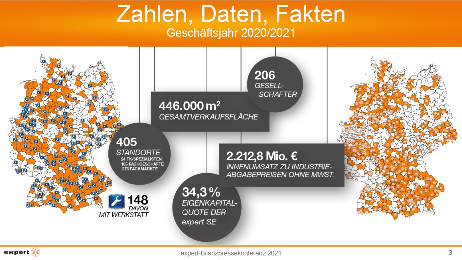 Im abgelaufenen Geschäftsjahr zählte die expert-Gruppe 206 Gesellschafter mit 405 Standorten (davon 62 als Regie-Betriebe) auf einer Fläche von über 446.000 Quadratmetern. An 148 Standorten wird eine eigene Service-Werkstatt betrieben. Die Anzahl der Fachmärkte bewegt sich auf stabilem Niveau und betrug zum Geschäftsjahresende 276. Diese Stabilität gelingt unter anderem durch zwölf erfolgreiche Nachfolgeregelungen.