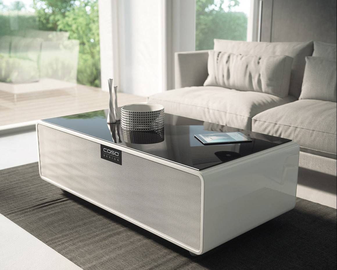 Um nichts weniger als eine Weltneuheit handelt es sich bei der neuesten Idee von Caso, einer Kombination aus Soundbar, Getränkekühler und Lounge-Tisch. Auf dem ersten Blick sieht die „Sound & Cool“ wie ein eleganter, stylischer Lounge-Tisch aus. Über das LED Touch-Display auf der Glasoberfläche lässt sich aber sowohl die Kühltemperatur des linken und rechten Fachs als auch die Musik steuern. Eine Bluetooth Schnittstelle, zwei USB-Anschlüsse und ein AUX-Anschluss sorgen für den notwendigen Musik-Input. Vier Lautsprecher mit insgesamt 60 Watt Leistung versprechen einen satten Sound.