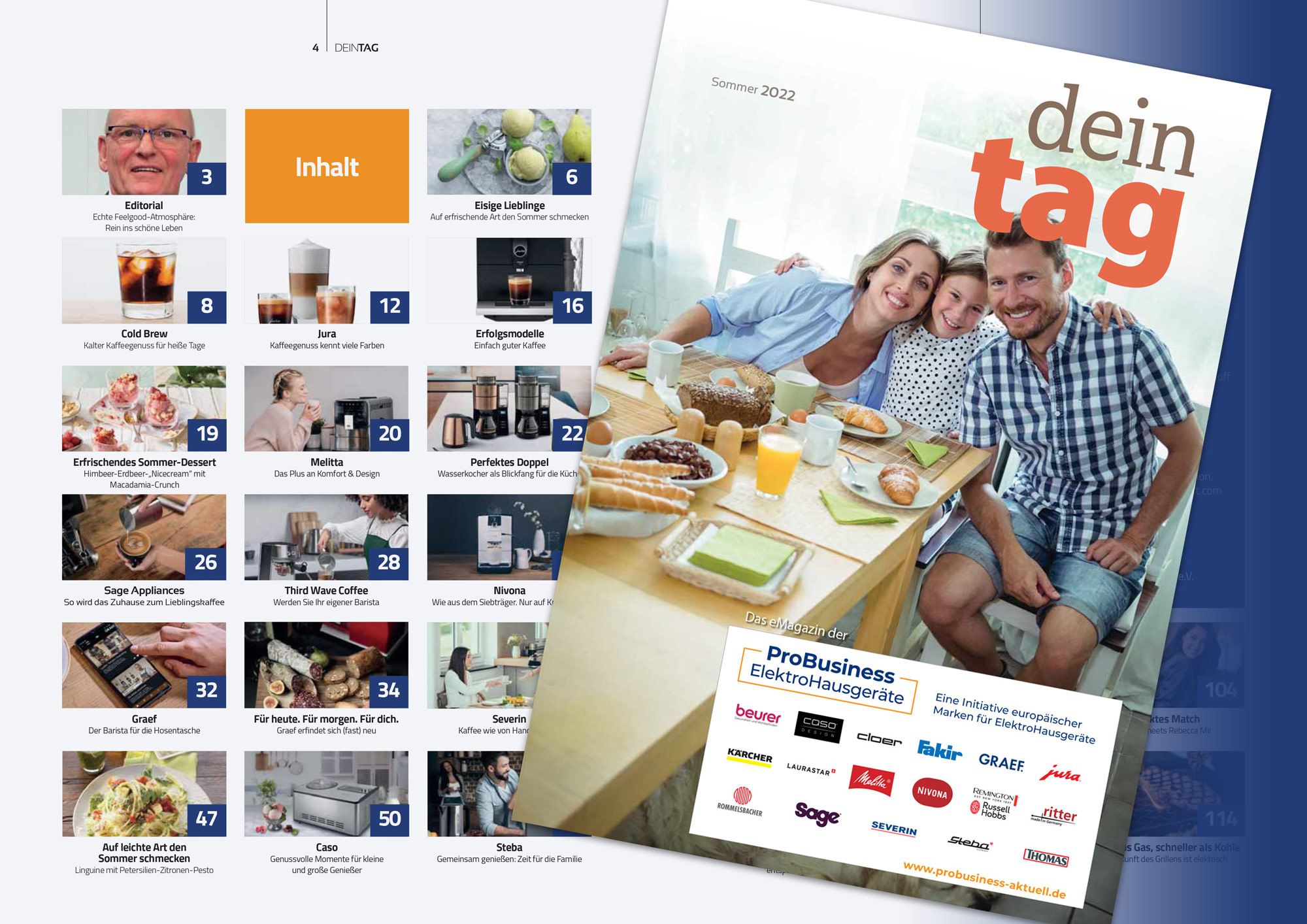 Die gleichsam chicen wie cleveren Hausgeräte der 17 ProBusiness-Marken begleiten die Leserinnen und Leser auch in der neuen Ausgabe auf 124 Seiten durch den Tag: vom Aufstehen an über das Mittagessen, die Kaffeepause und die abendlichen Genussfreuden bis hin zum Schlafengehen. Dabei stehen die Produkte und ihre Anwendungsvielfalt mit den gelebten Attributen wie Innovation und Digitalisierung, Qualität und Nachhaltigkeit im Mittelpunkt.