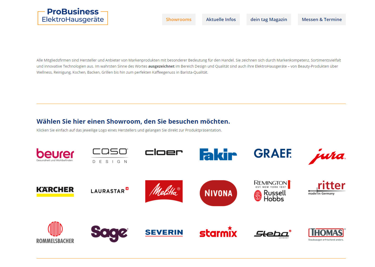 ProBusiness, die Marketing-Initiative von 18 mittelständischen Hausgeräte-Herstellern und -Marken, zeigt sich in diesem Sommer so agil wie selten, macht dabei den nächsten Schritt in der digitalen Transformation: Nachdem erst vor wenigen Wochen das eMagazin „Dein Tag“ veröffentlicht wurde, überrascht ProBusiness jetzt auf seiner eigenen Website www.probusiness-aktuell.de mit einer signifikanten Neuerung: Alle 18 Mitglieder stellen sich in jeweils eigenen Showrooms mit ihren Geräte-Neuheiten und Hero-Produkten vor.