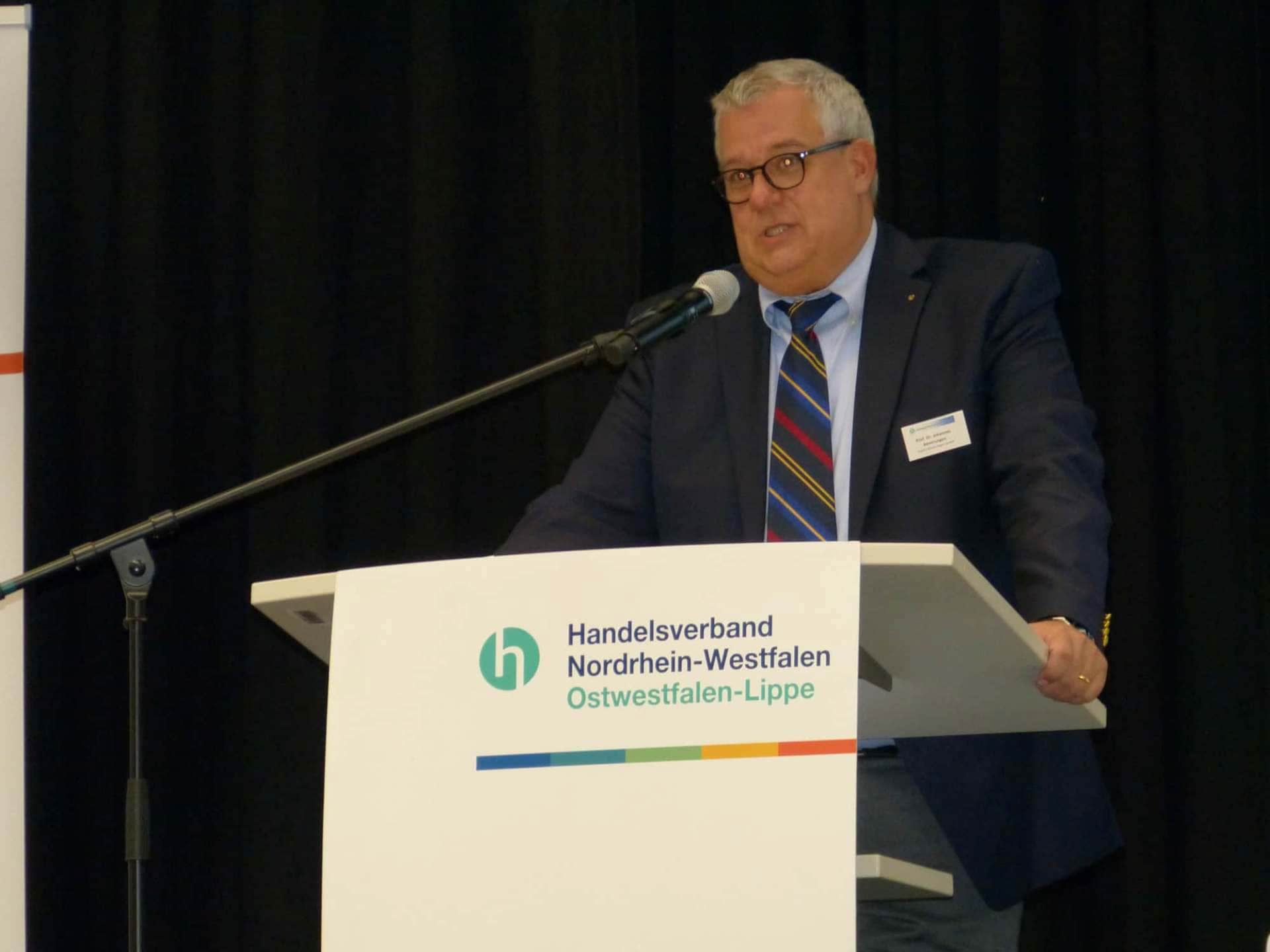Prof. Dr. Johannes Beverungen, Vorsitzender des Handelsverbandes Ostwestfalen-Lippe, anlässlich der Delegiertenversammlung in Delbrück am 9. Juni. Prof. Dr. Beverungen ist Mitinhaber von Expert Beverungen in Paderborn und lehrt als Experte für Handelsmanagement an der Dualen Hochschule Baden-Württemberg.