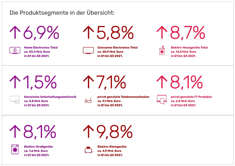 Mit einem Umsatz von knapp 21 Mrd. EUR konnte der Bereich Consumer Electronics in den ersten drei Quartalen 2021 ein Plus von 5,8% im Vergleich zum Vorjahreszeitraum aufweisen. Dabei zeigte das Segment der privat genutzten IT-Produkte mit einem Umsatzzuwachs von 8,1% auf mehr als 6 Mrd. EUR die höchste Steigerungsrate.