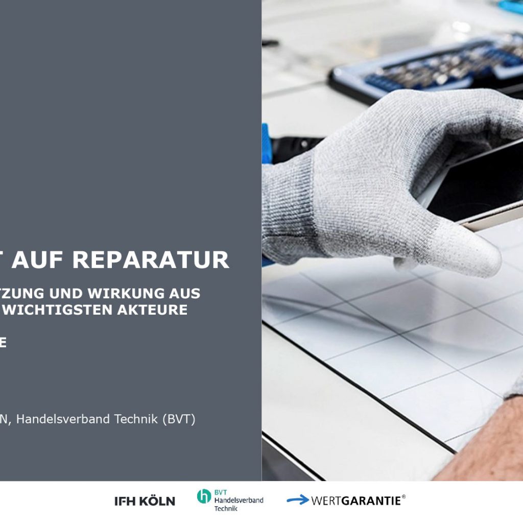 Im Auftrag des Handelsverband Technik (BVT) und des Spezialversicherers und Fachhandelspartners Wertgarantie hat das IFH KÖLN die EU-Richtlinie aus Sicht von Verbrauchern, Herstellern, Fachhandel und Ersatzteilwirtschaft in Deutschland erstmalig empirisch untersucht und bietet damit einen 360°-Blick auf die Richtlinie und ihre Auswirkungen auf das Reparaturgeschehen.