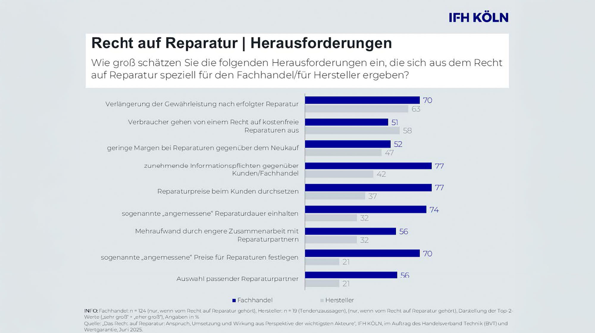 Im Auftrag des Handelsverband Technik (BVT) und des Spezialversicherers und Fachhandelspartners Wertgarantie hat das IFH KÖLN die EU-Richtlinie aus Sicht von Verbrauchern, Herstellern, Fachhandel und Ersatzteilwirtschaft in Deutschland erstmalig empirisch untersucht und bietet damit einen 360°-Blick auf die Richtlinie und ihre Auswirkungen auf das Reparaturgeschehen.