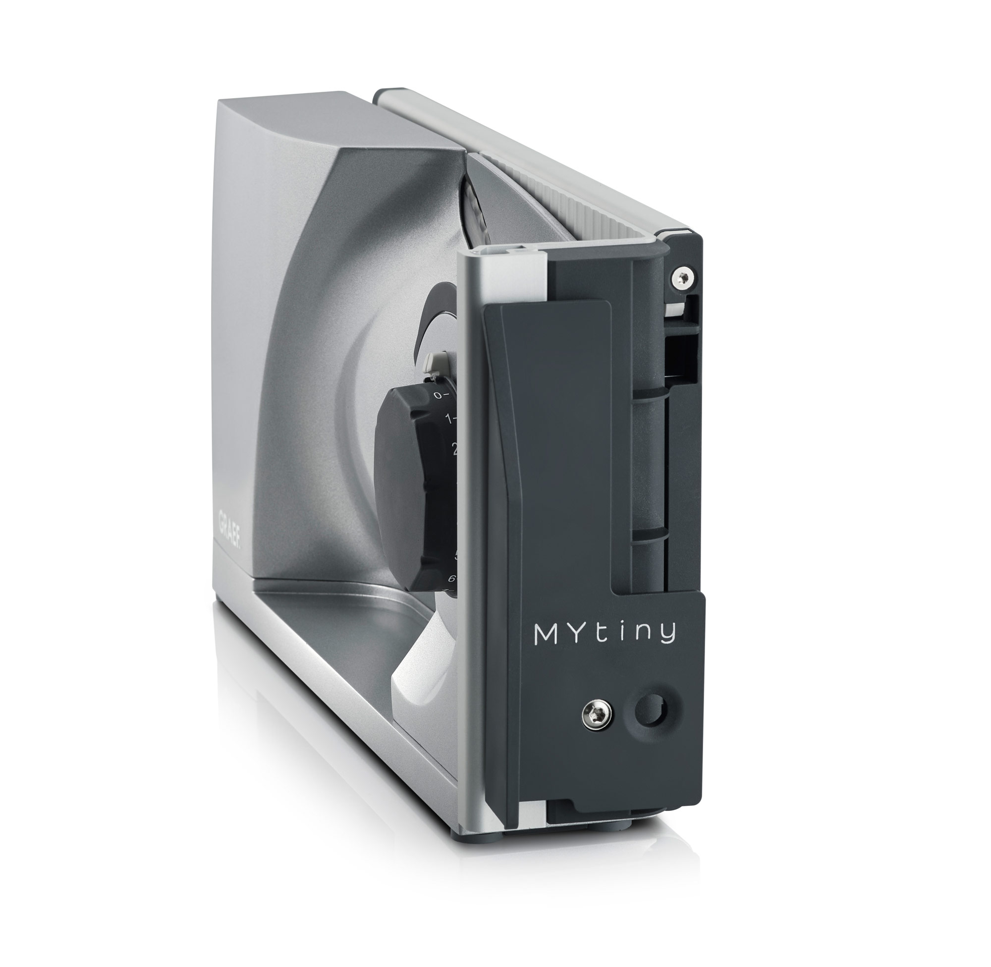 Nach Auszeichnungen wie dem Kitchen Innovation Award und dem Testergebnis „sehr gut“ (Note 1,0) der „Technik zu Hause“-Redaktion ist der Red Dot Award ein weiterer Meilenstein für das Produkt. Der MYtiny wurde speziell für kompakte Wohnformen wie kleine Küchen, Tiny Houses oder den Einsatz beim Camping konzipiert. Zusammengeklappt ist das Gerät nur 8 cm hoch und lässt sich platzsparend in Schubladen verstauen. Die stufenlos einstellbare Schnittbreite bis 15 mm, eine 170-mm-Wellenschliffklinge sowie ein integriertes Kabelfach gehören zur Ausstattung. Vier technische Innovationen des Geräts wurden zum Patent angemeldet.