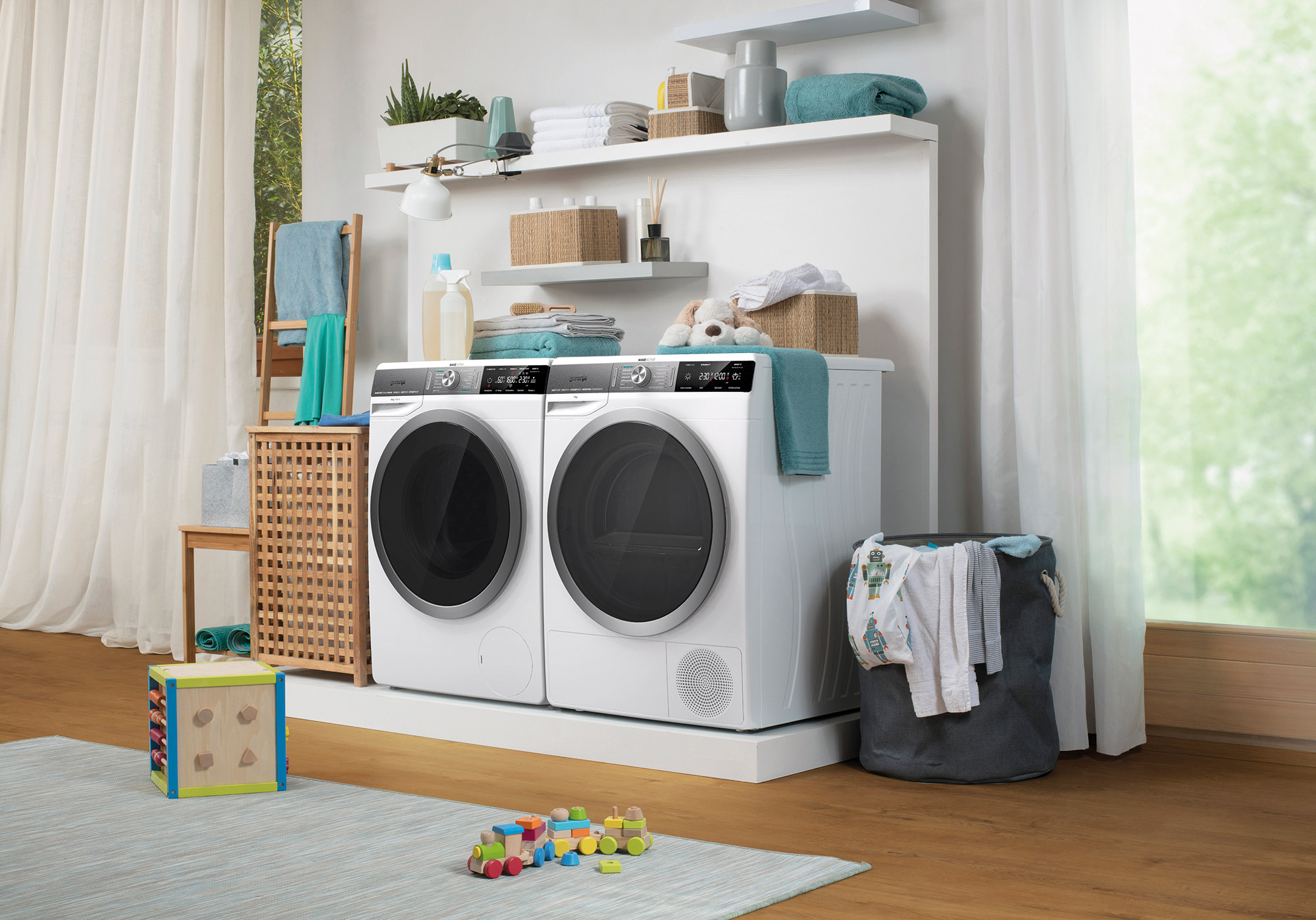Bei der Entwicklung der neuen Waschmaschine und des Trockners folgte das Designstudio-Team der Markenphilosophie „Life Simplified“. Beide Maschinen verfügen über eine hochmoderne Benutzeroberfläche. Der Benutzer kann mit nur einem Schritt mittels des intuitiven Touchscreens die optimale Wasch- oder Trocknungseinstellung vornehmen. Die Maschinen vermitteln Robustheit und Langlebigkeit, bieten aber dennoch mit ihren akzentuierten weichen Linien eine hervorragende Ergonomie. Beide Maschinen verfügen über eine neue WaveActive-Trommel, die die Wascheffizienz verbessert und beim Trocknen die Fasern weicher macht.
