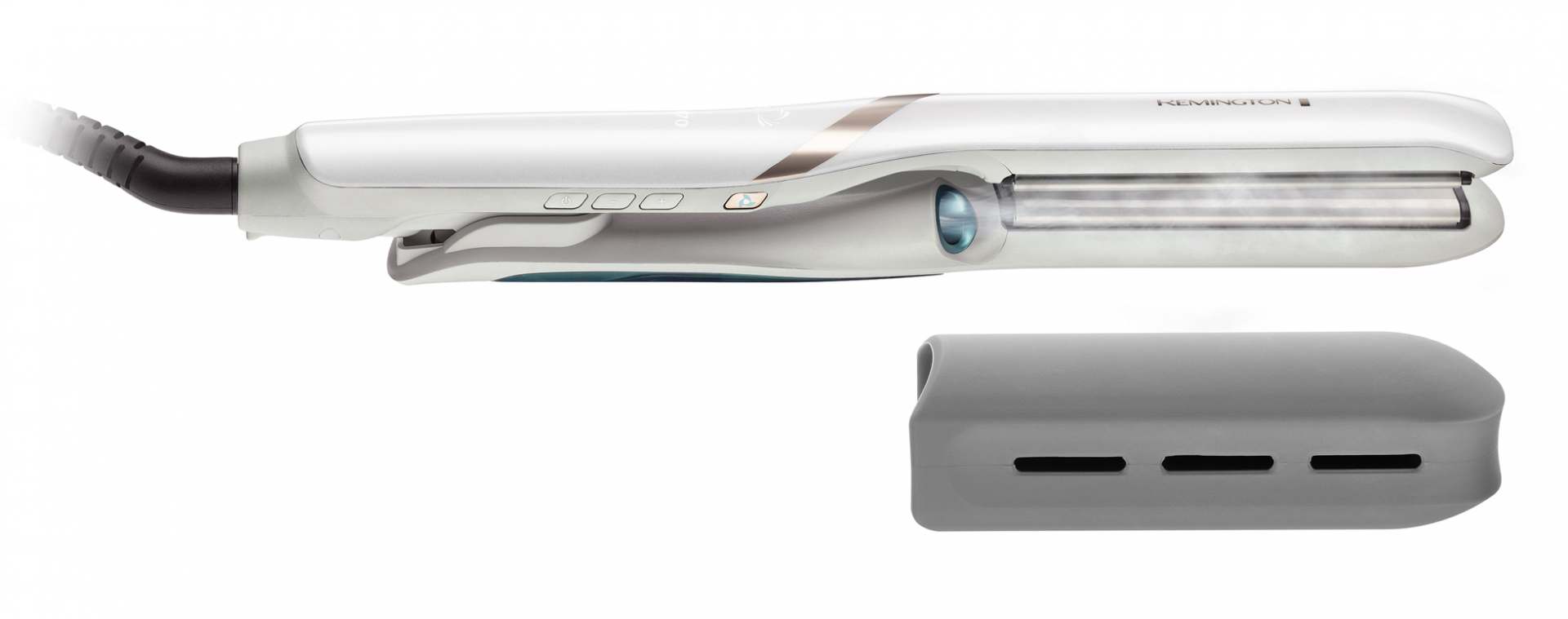 Angebracht ist die Nebelkammer seitlich an den Stylingplatten. So ist sichergestellt, dass die Feuchtigkeit vor dem Glätten vom Haar adsorbiert wird. Die integrierten Sensoren des leichten und schlanken Gerätes sorgen für eine gleichmäßige Temperatur der Stylingplatten – für nachgewiesene Ergebnisse in nur einem Zug.