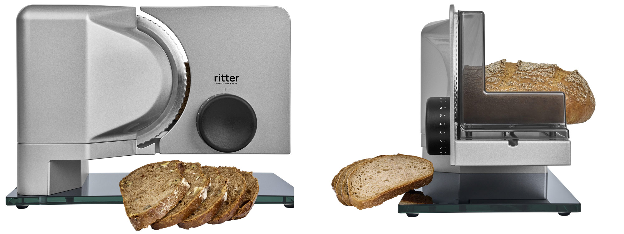 Das Gerät wird durch einen 65 Watt Eco-Motor angetrieben, der im Vergleich zum Vorgängermodell 20% sparsamer und trotzdem 50% kraftvoller ist. Der Allesschneider sono2 wird nicht nur im klassischen ritter-silbermetallic erscheinen, sondern auch in schwarz erhältlich sein. Ebenso ergänzt sich die Farbpalette des Allesschneiders E 16 und wird in ritter-silbermetallic und schwarz verfügbar sein.