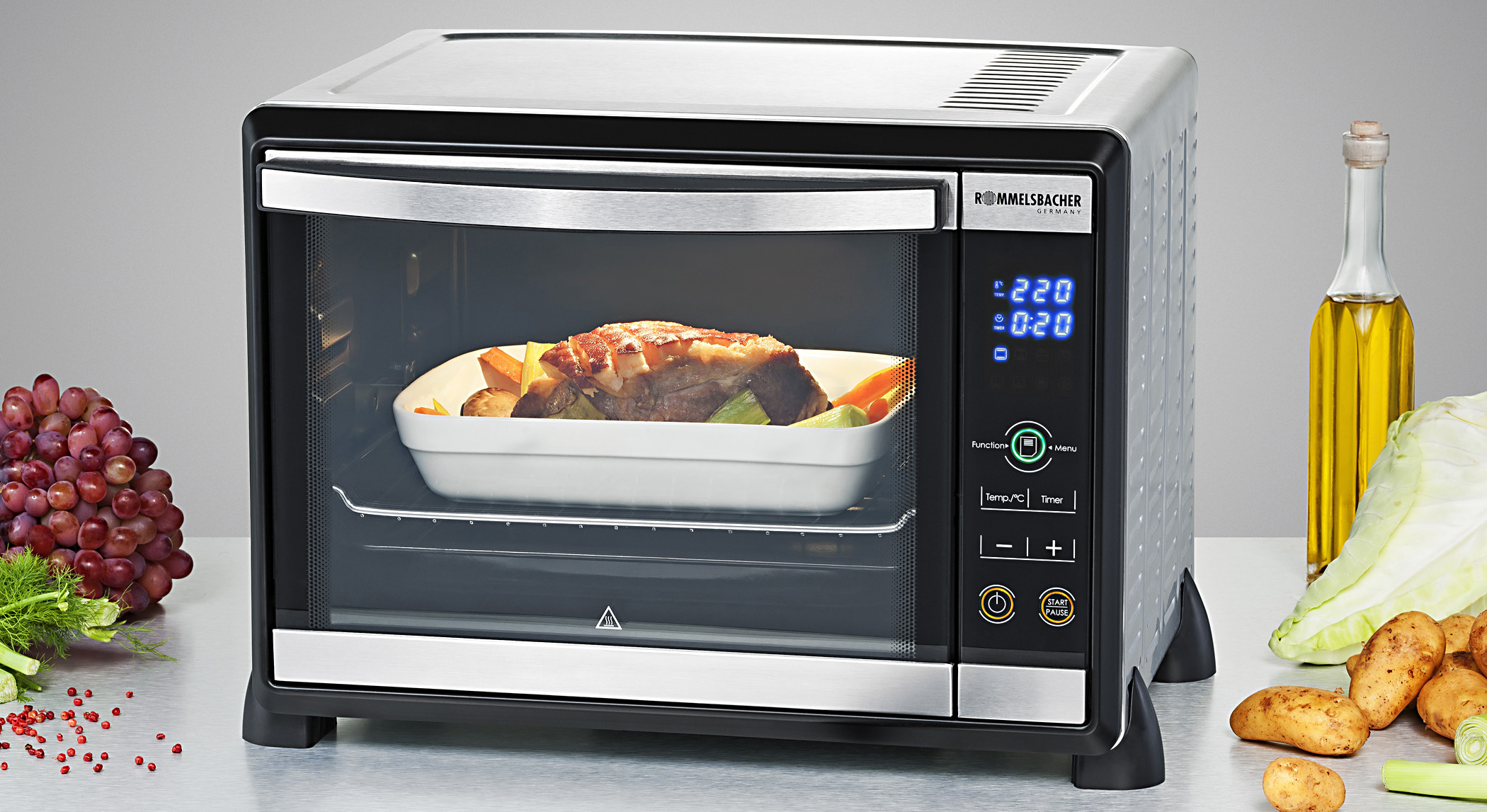 Der Rommelsbacher Back & Grill Ofen BGE 1580/E verfügt über eine präzise Temperatursteuerung, die sich besonders zum Niedertemperatur- und Schongaren eignet. Die vielseitigen Kombinationsmöglichkeiten von Ober- und Unterhitze mit praktischen Zusatzfunktionen, wie Umluft oder Drehspieß, lassen Hähnchen, Braten und Aufläufe perfekt garen und liefern beste Backergebnisse bei Kuchen und Pizza.
