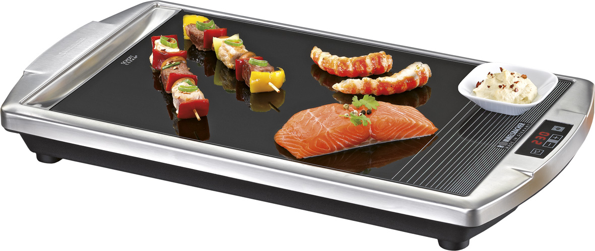 Für Sicherheit sorgen Standfestigkeit und automatisches Abschalten im Falle einer Überhitzung. Im Zubehör enthalten sind ein Reinigungsschaber sowie eine Anleitung mit Rezeptideen.