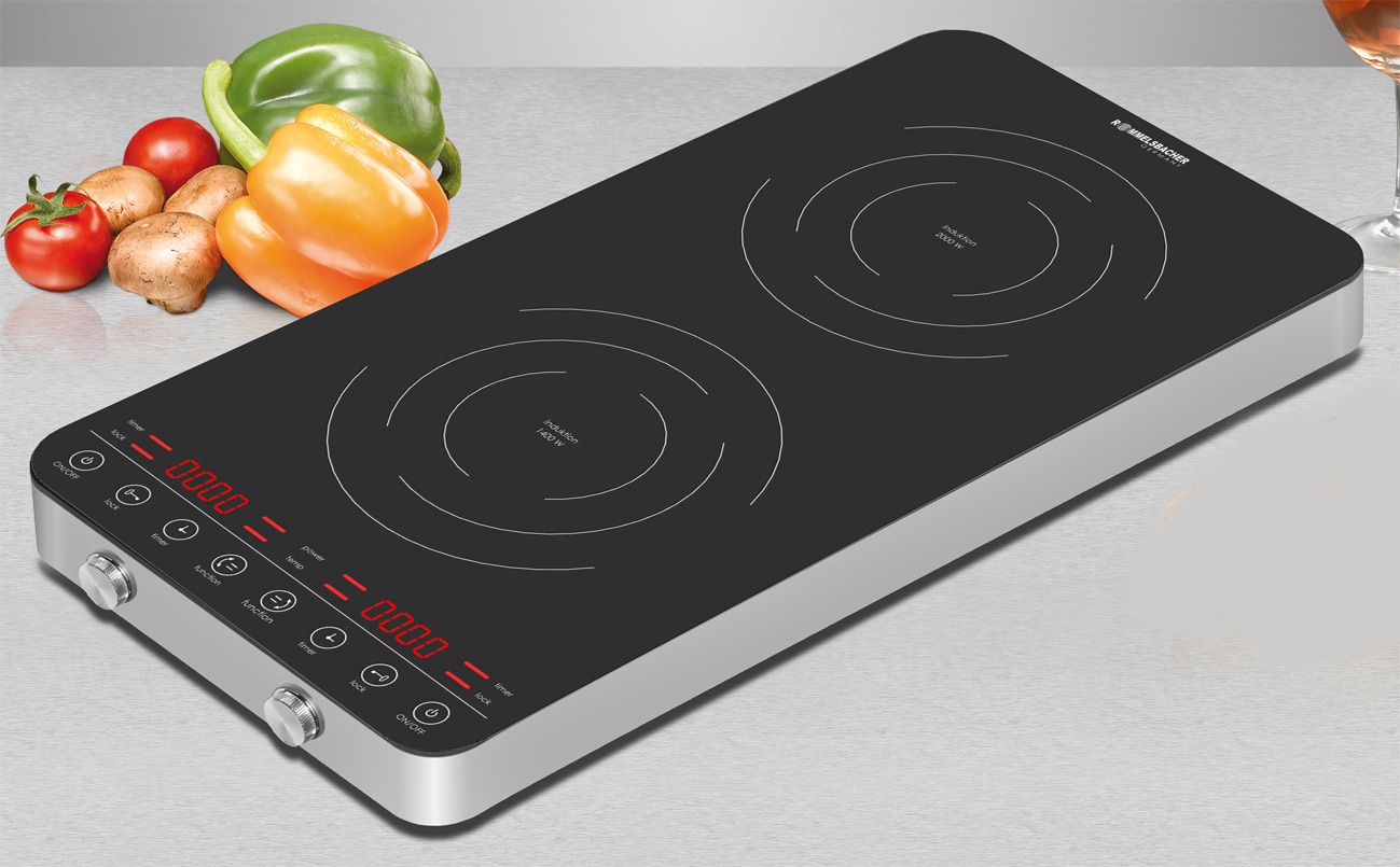 Die Rommelsbacher CT 3430 Induktionskochtafel hat zwei hinter einander angeordnete Heizzonen. Die .Easy-to-use. Bedienerführung macht das Kochen einfach. Die gewünschte Funktion (Temperatur/Leistung/Laufzeit) wird über Touch Control Sensoren gewählt und mit dem Drehwähler der jeweiligen Kochzone nach Wunsch geregelt. Ein LED-Display sorgt für guten Überblick. Die Oberfläche ist ohne Rillen und Zwischenstege. Für hohe Gebrauchssicherheit sorgen Restwärmeanzeigen, Topferkennung und Kindersicherung.