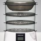 Der Rommelsbacher Dampfgarer DGS 850 verfügt über drei Dampfeinsätzen, in denen verschiedene Nahrungsmittel gleichzeitig zubereitet werden können. Die Turbo-Speed Dampferzeugung verteilt die Hitze gleichmäßig und schnell. Mit dem Aromen-Verteileraufsatz kann eine zusätzliche Aromatisierung aller Ebenen mit Kräutern und Gewürzen vorgenommen werden. In der Universalschale können Suppen, Reis und mehr schonend zubereitet werden. Der Wasserstand im Gerät kann von außen kontrolliert und nachgefüllt werden. Die manuelle Steuerung mittels der 60 Min. Zeitschaltuhr lässt sich jederzeit individuell anpassen. Einfache Reinigung und eine platzsparende Aufbewahrung mit ineinander stapelbaren Dampfeinsätzen runden die Ausstattung ab.