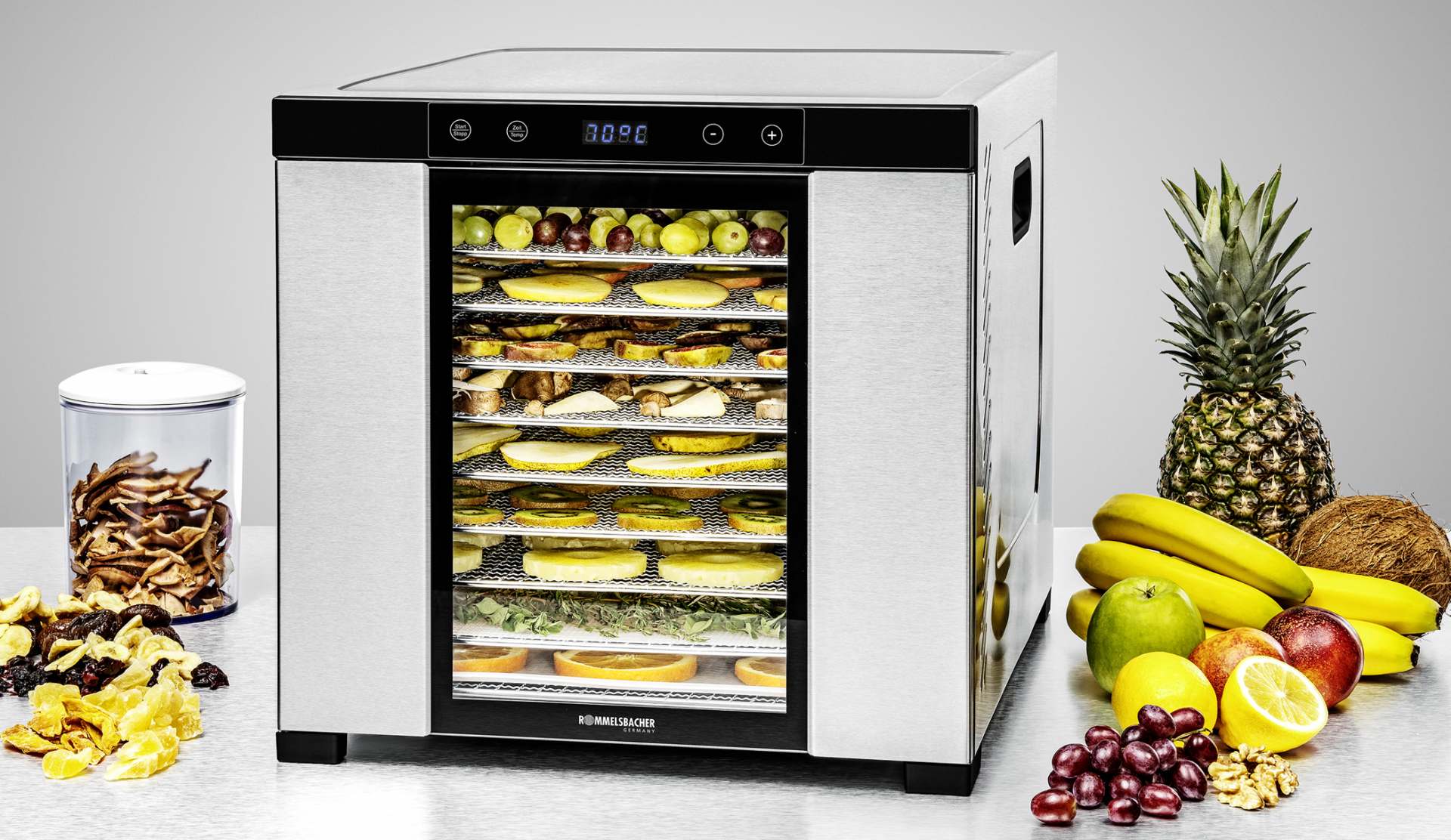Der Rommelsbacher Dörrautomat DA 1000 ermöglicht schonendes Konservieren von Obst, Gemüse, Kräutern, Pilzen, Fleisch, Fisch und vielen anderen Lebensmitteln. Geeignet ist das Gerät für große Mengen und den semiprofessionellen Einsatz.
