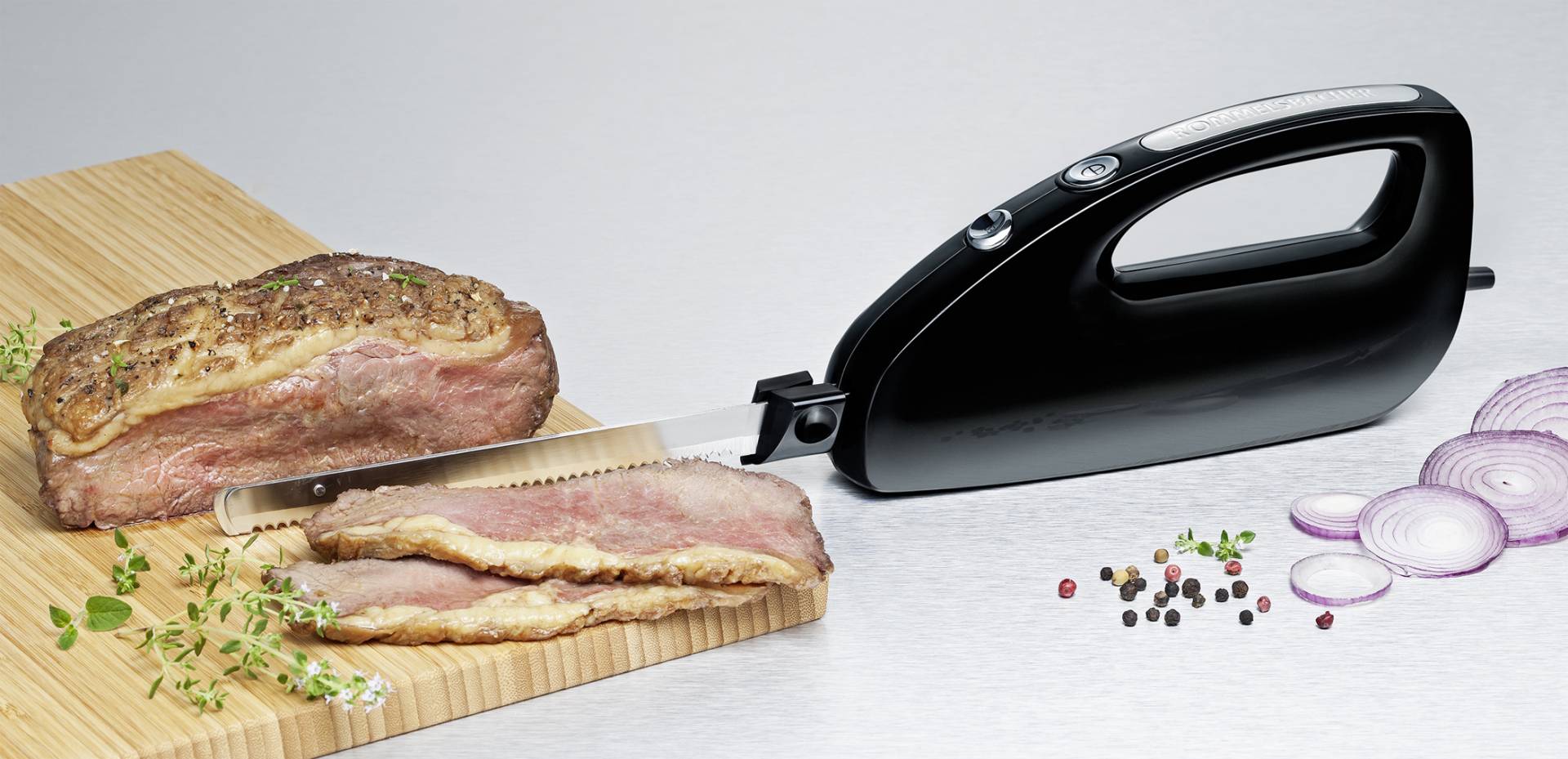 Das Rommelsbacher Elektromesser EM 150 schneidet Brot, Gebäck, Fleisch und Geflügel. Durch den ergonomisch geformten Handgriff lässt sich das Gerät leicht und angenehm bedienen. Das Messerklingenpaar mit feiner Zahnung ist ideal, um selbst empfindlichste Lebensmittel wie Sahne- oder Cremetorten in Stücke zu zerteilen.