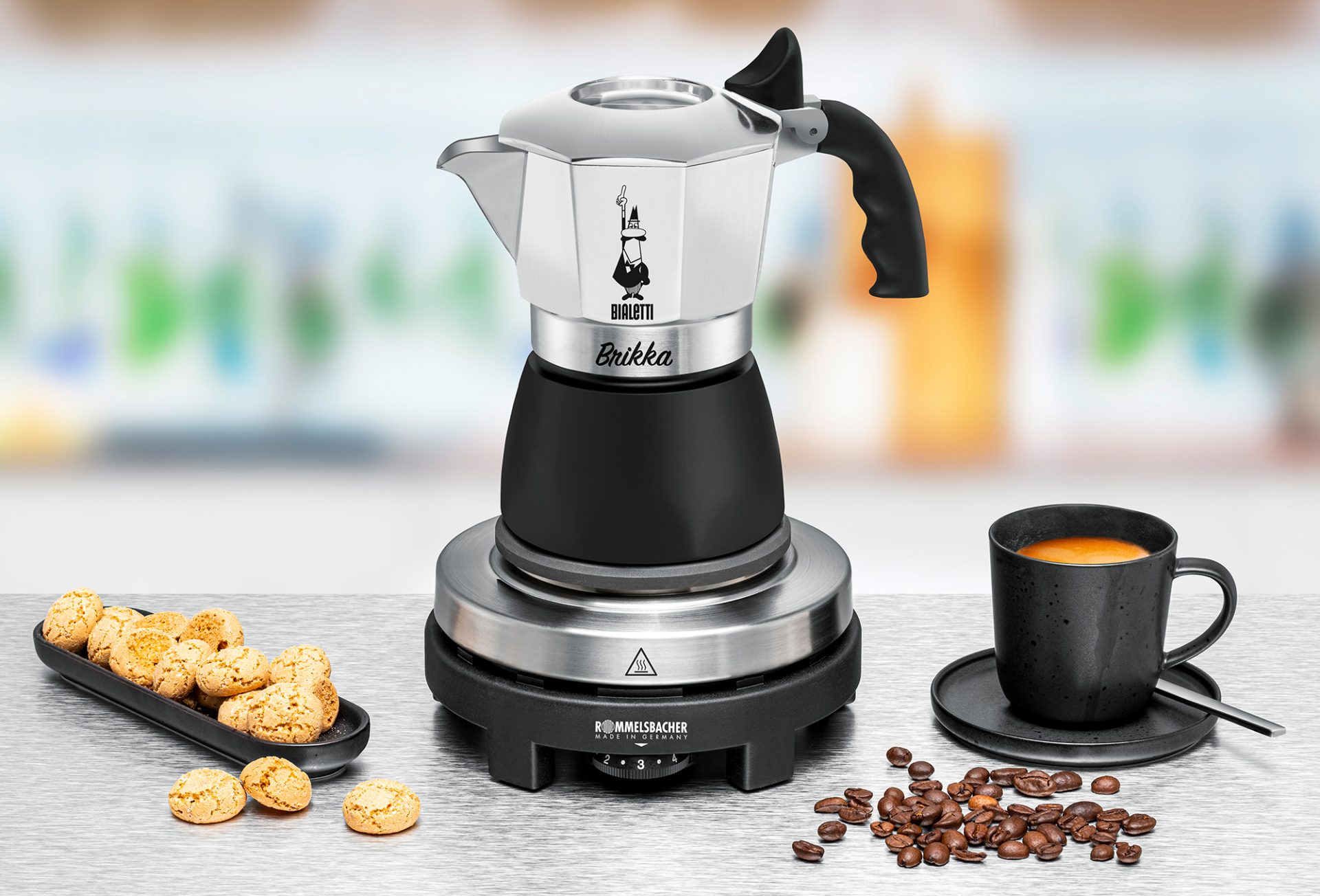Das Rommelsbacher Espresso Geschenkset RK 505K besteht aus der Rommelsbacher Reise-/Minikochplatte RK 501 und der Bialetti Mokka Kanne Brikka.