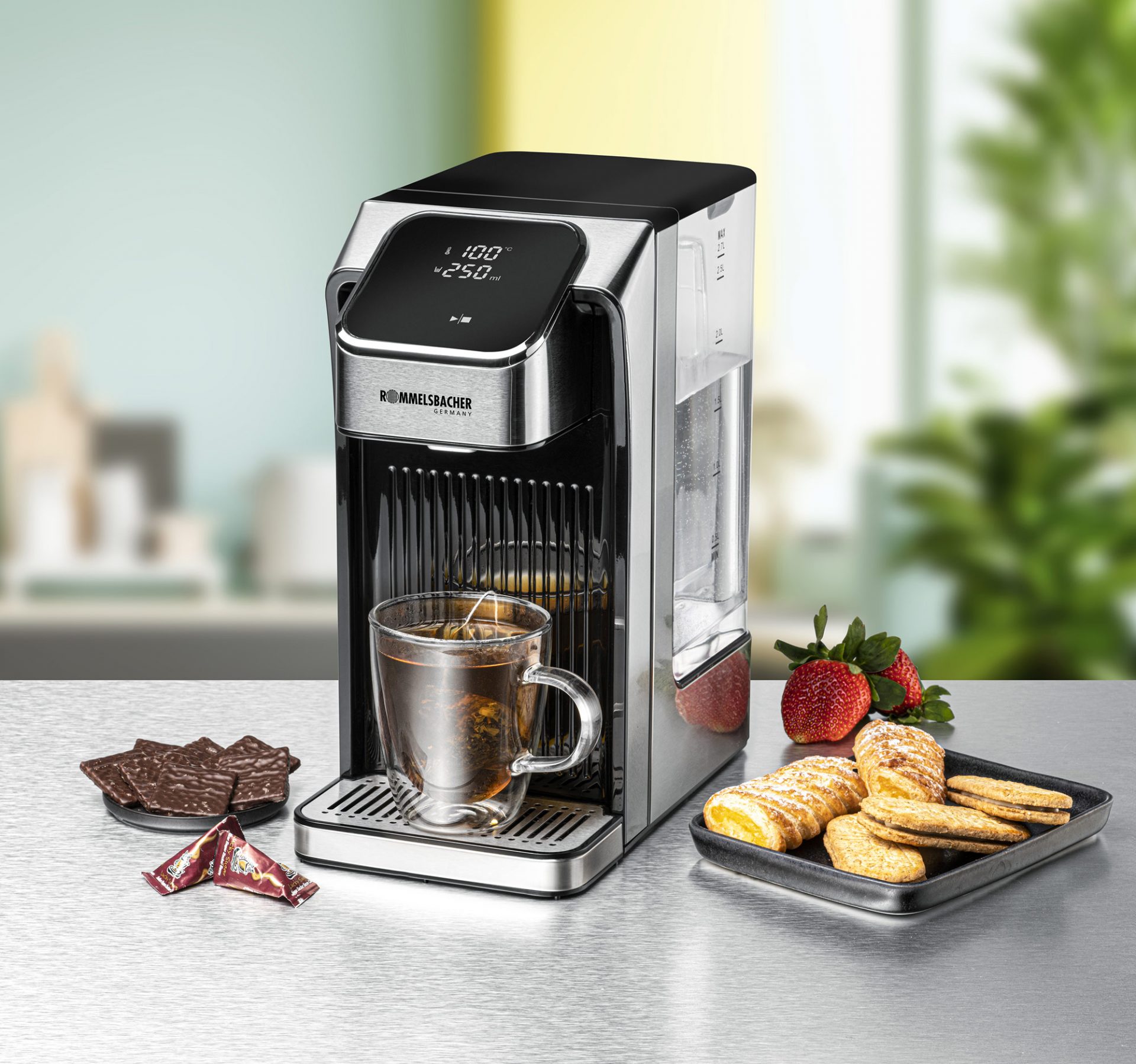 Die Messe-Neuheit von Rommelsbacher ist perfekt für alle Tee-Sorten, Instantsuppen und -getränke, und ebenso ideal für die schnelle Zubereitung von Babynahrung. Insgesamt 13 Temperaturstufen plus ein direkter Kaltwasserbezug sind möglich, die Portionsgrößen sind in 50 ml-Stufen von 100 ml bis 400 ml variierbar. Clever: Die favorisierte Einstellung lässt sich individuell abspeichern.