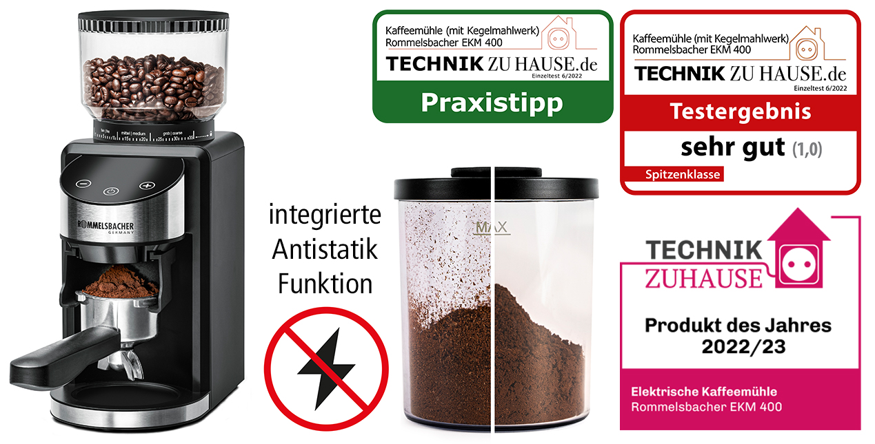 Das Fazit mit dem Testergebnis „sehr gut“ (1,0): „Mit der Rommelsbacher Kaffeemühle EKM 400 hat man ein Gerät der Spitzenklasse. […] Zwei unterschiedliche Betriebsmodi, die Einstellung von Portionsanzahl und Pulvermenge pro Portion sind Funktionen, die das gewisse Extra bieten […] und sind der Redaktion einen Praxistipp wert.“