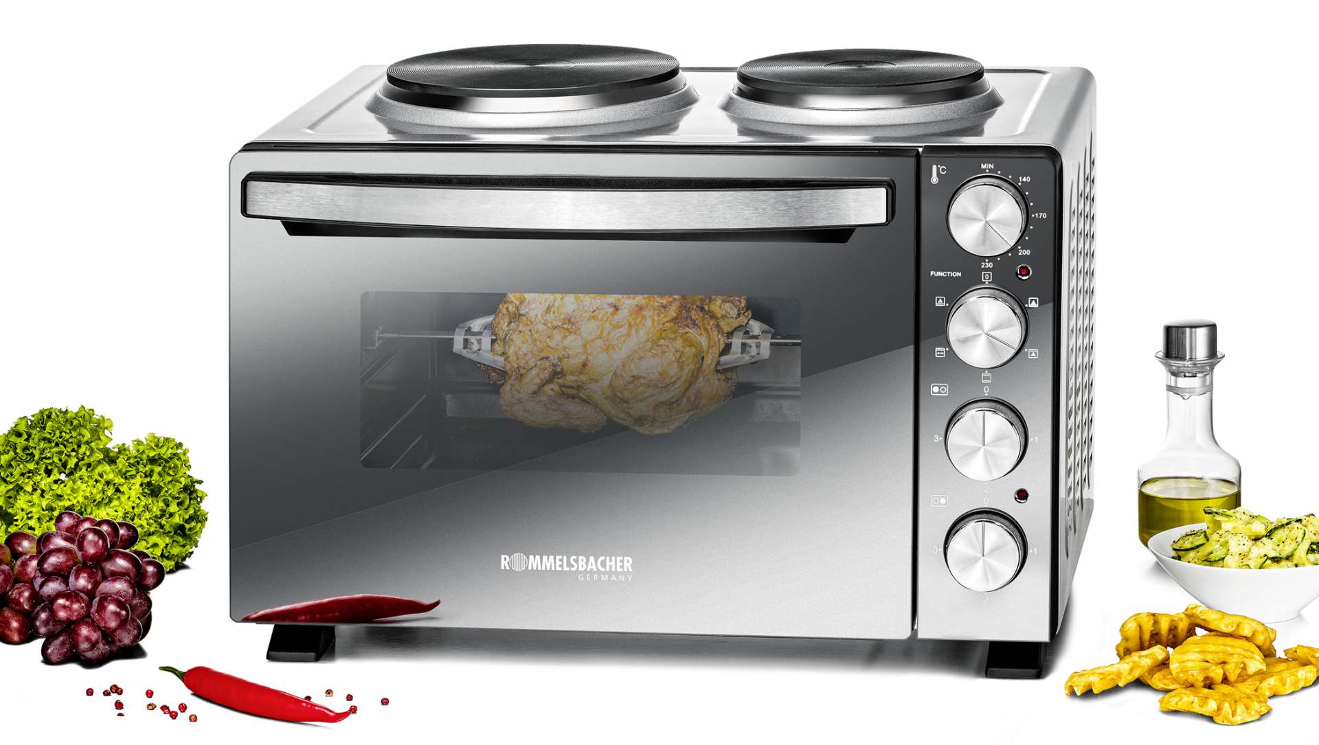 Die Rommelsbacher Kleinküche KM 3300 hat zwei massive Kochplatten (180 mm Ø / 1000 W – 145 mm Ø / 750 W). Deren leistungsgesteuerte Regelung erfolgt über einen 4-Takt Schalter. Der Backofen hat ein Volumen von 30 Liter, drei Einschubebenen und Platz für Backformen bis 280 mm Durchmesser.