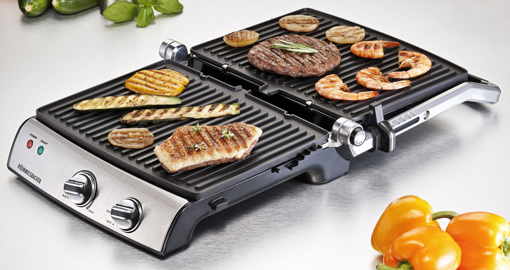 Mit der fünffachen Höhenverstellung passt sich das Gerät an das jeweilige Grillgut an. Bei größeren Portionen klappt man die beiden Flächen einfach auf und das Gerät wird zum Tisch- und Partygrill.