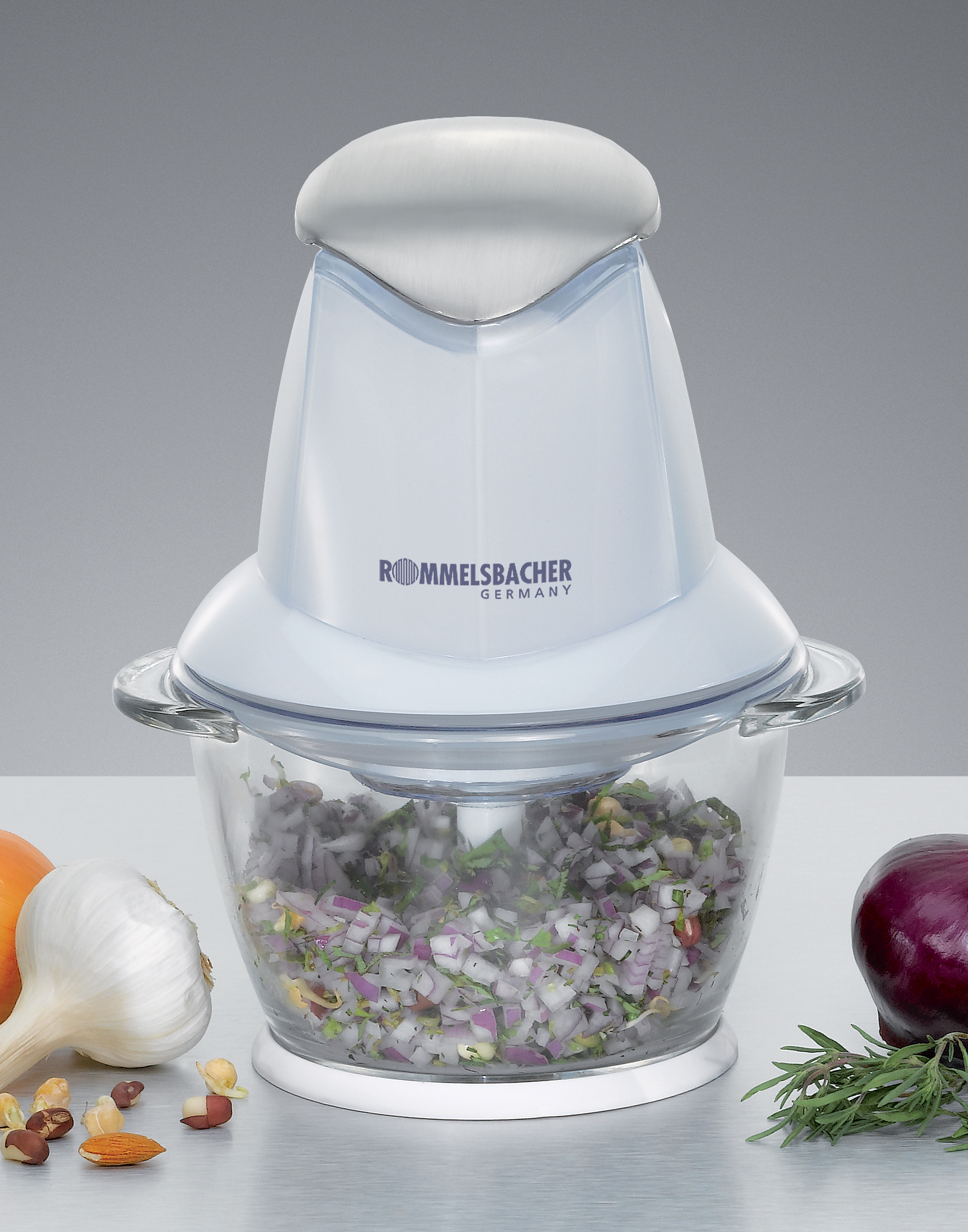 Schnippeln und hacken – eine häufig zeitraubende Tätigkeit, die unter Umständen auch noch unangenehme Gerüche an den Händen und tränende Augen hinterlässt. Sehr viel komfortabler ist es, Zwiebeln, Gemüse, Nüsse oder Kräuter einfach in den Rommelsbacher Universal Zerkleinerer UZ 400/G geben und dem Küchenprofi beim Arbeiten zuzusehen. Ein leichter Druck auf die Einschalttaste und das Gerät verarbeitet die Lebensmittel wie gewünscht.