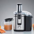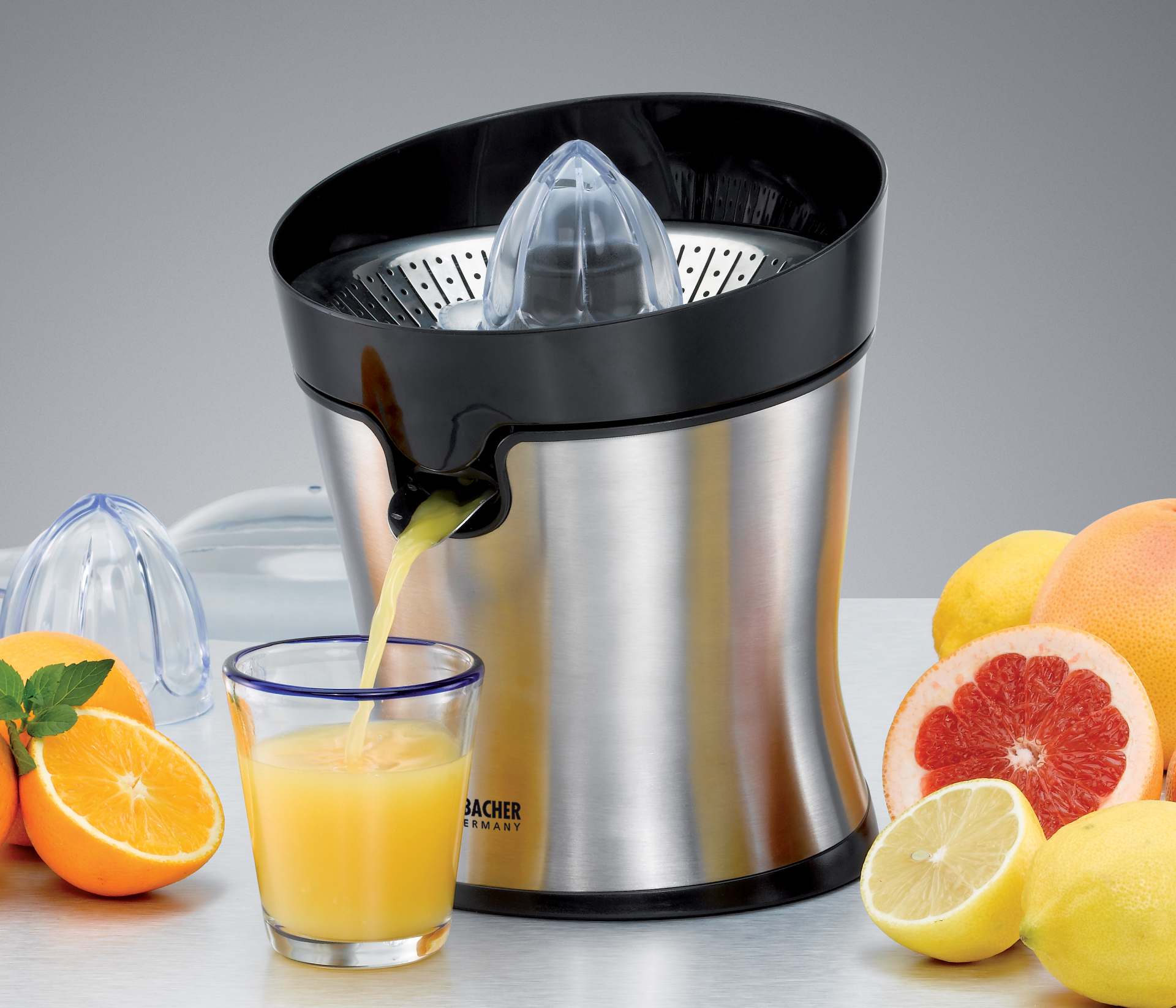 Jeder kennt die Empfehlung, täglich fünf Portionen Obst und Gemüse zu essen. Sich daran zu halten, ist gar nicht so einfach. Frisch zubereitete Säfte sind eine gute Alternative, schließlich bleiben beim Pressen alle Vitamine erhalten. Die elegante Edelstahl Zitruspresse ZP 85/E von Rommelsbacher eignet sich zum Pressen von Orangen, Zitronen und Grapefruits und ist ein Schmuckstück für jede Küche. Wegen des leistungsstarken Motors reicht ein leichter Druck, um die Frucht bis auf den letzten wertvollen Tropfen auszupressen. Der Saft fließt über eine klappbare Auslauftülle direkt in ein Glas. Mit dem praktischen Nachtropfstopp geht nichts daneben. Zum Zubehör gehören zwei verschiedene Presskegel für große und kleine Früchte. Ein praktischer Deckel schützt vor Staub. Das Reinigen der Rommelsbacher Zitruspresse ZP 85/E ist ein Leichtes: Das massive Edelstahlsieb kann abgenommen und zusammen mit Presskegeln, Saftauffangbehälter und dem Staubschutzdeckel in der Spülmaschine sauber gemacht werden.
