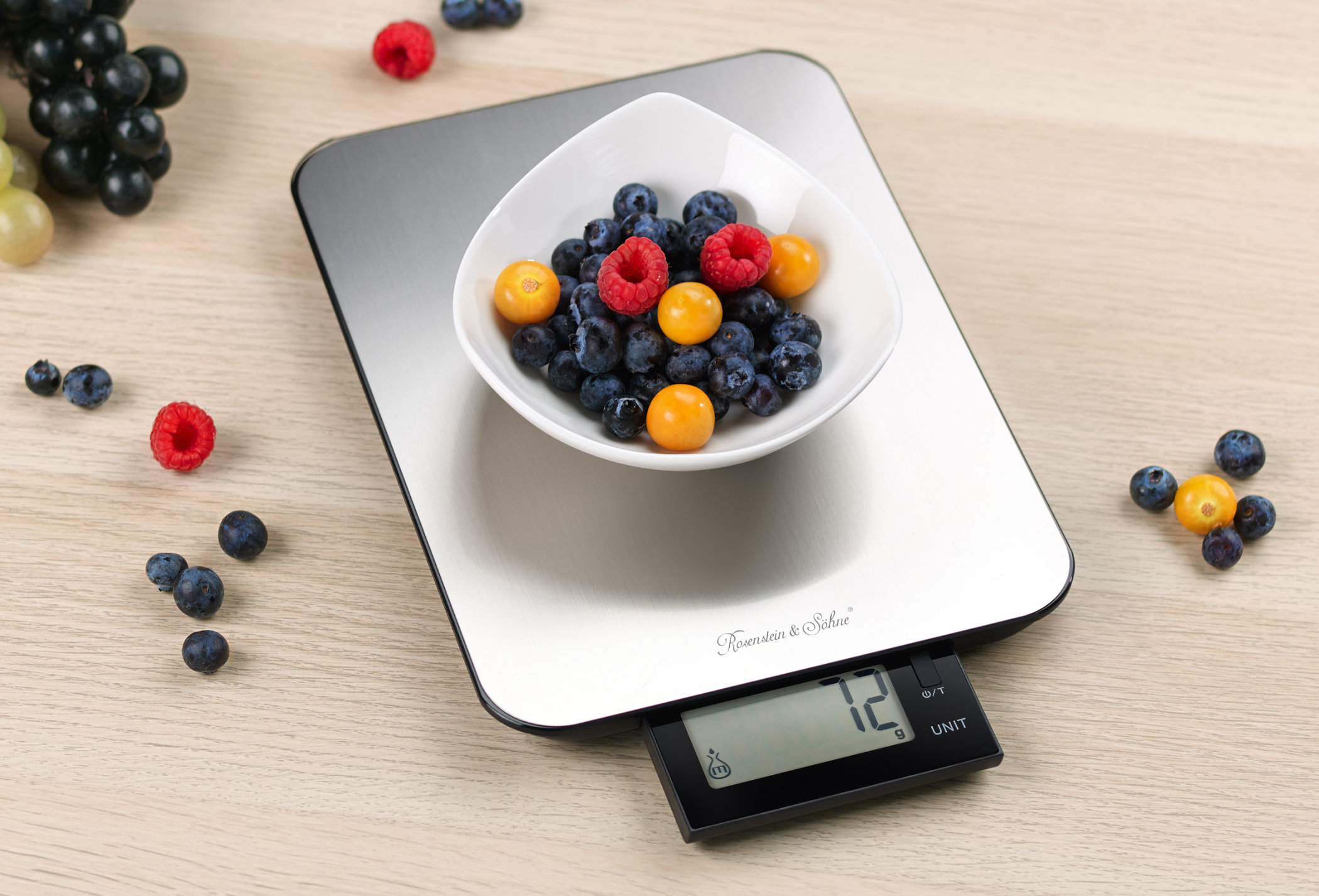 Die Rosenstein & Söhne Küchenwaage verfügt über eine hygienische Edelstahl-Oberfläche und misst auch große Mengen und Flüssigkeiten grammgenau ab.