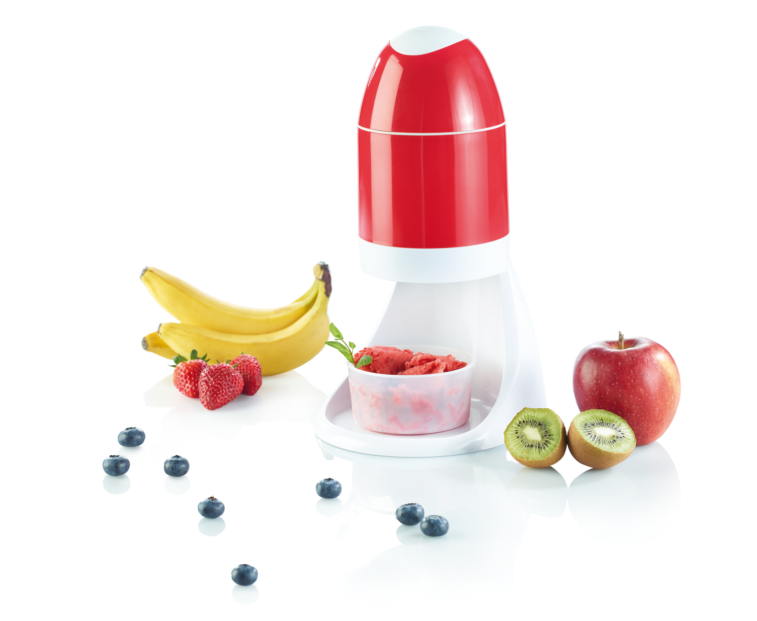 Auch hier wird anschließend in zwei mitgelieferten Kunststoffbechern mit leckerem Sirup oder mit frischen, pürierten Früchten aromatisiert, gefärbt und angerichtet. Zugegeben, es bedeutet zwar etwas Arbeit und viel Liebe zum Produkt, aber färbt man einzelne Schichten Shaved-Ice mit unterschiedlichem Sirup ein, dann entsteht schnell und einfach eine kunterbunte Erfrischung für die ganze Familie!