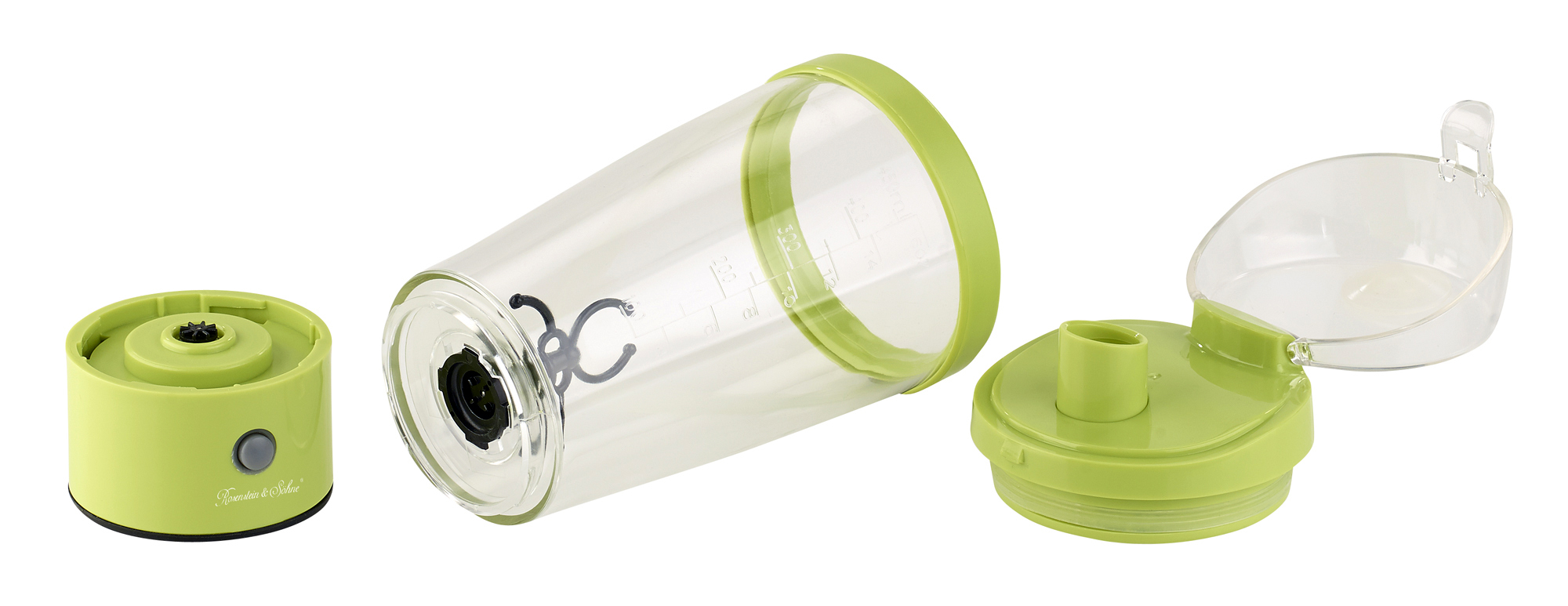 Der selbstrührende Becher spült Mixer und Löffel in einem. So mischt man bequem Getränke und reinigt Becher und Quirl anschließend schnell und einfach mit klarem Wasser.