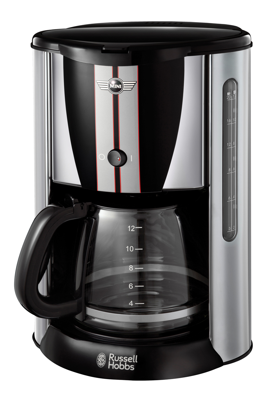 Die Russell Hobbs Kaffeemaschine Mini Classic ist neben einem Toaster und einem Wasserkocher Bestandteil der neu aufgelegten Serie Mini. Die Geräte sind in lackiertem Edelstahl in edlem Schwarz gehalten. Die Mini-typischen Ralleystreifen sind dabei in kühlem Grau mit roten Akzenten abgesetzt. Und auch das klassische Mini Logo darf auf Wasserkocher, Kaffeemaschine und Toaster nicht fehlen.