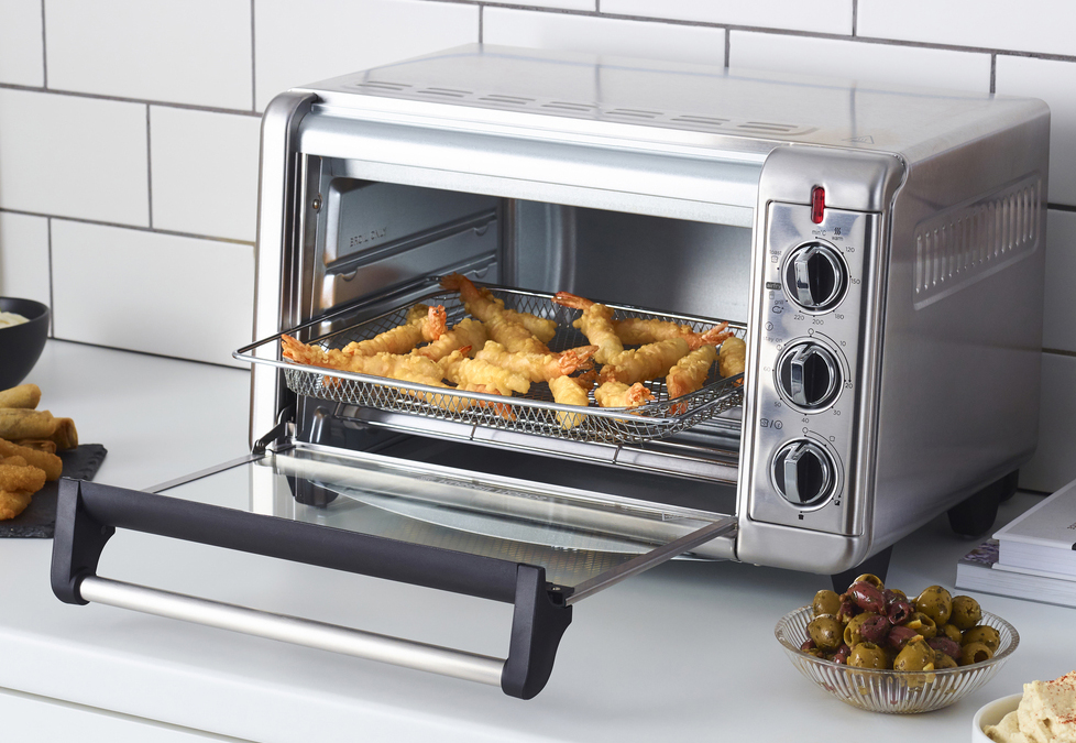 Nutzbar ist das Kombigerät als Heißluftfritteuse, Backofen, Grill oder Toaster. Die Warmhaltefunktion ermöglicht, dass frisch zubereitete Speisen auch nach einer Stunde nichts von ihrem Aroma eingebüßt haben. Der zirkulierende Konvektionsluftstrom sorgt für ein schnelles und gleichmäßiges Garen, so dass im Mini Backofen Speisen 2,5 Mal schneller und 63 % energieeffizienter zubereitet werden können. Dies im Verglich mit einem konventionellen Backofen beim Backen einer gefrorenen Käse-Pizza bei 200° C. Die Aufheizzeit ist 4 Mal schneller, als die Aufheizzeit auf 220° C in einem konventionellen Backofen.