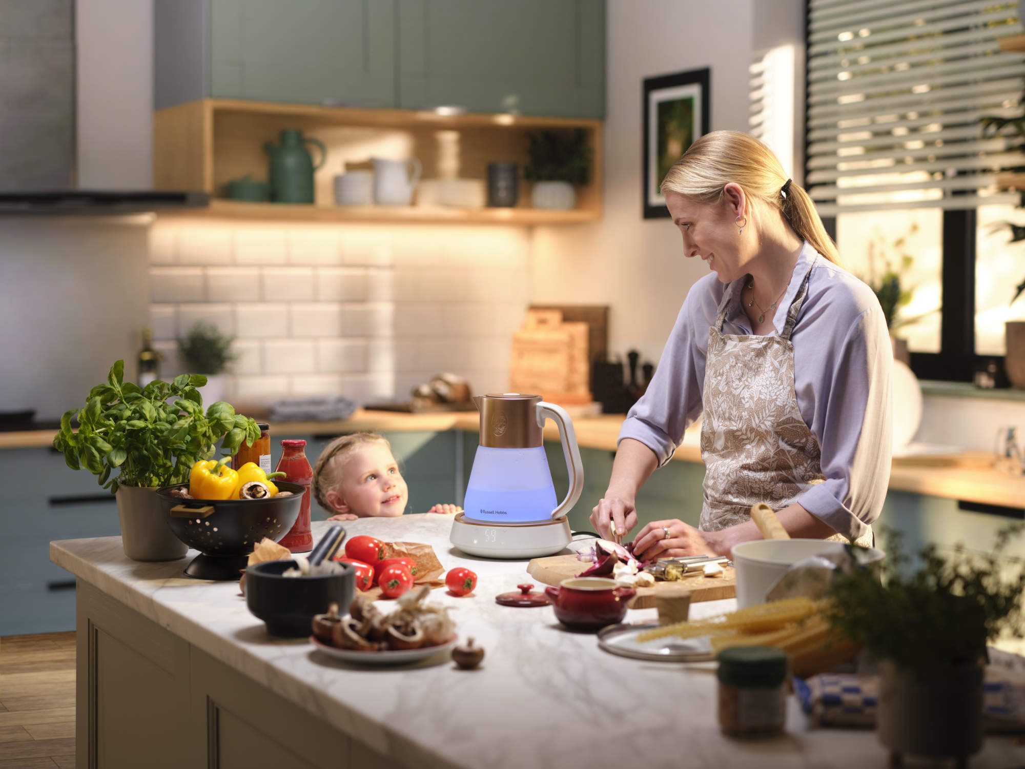 Der Calm Wasserkocher von Russell Hobbs schaft durch Farblichtakzente eine angenehme Atmosphäre.