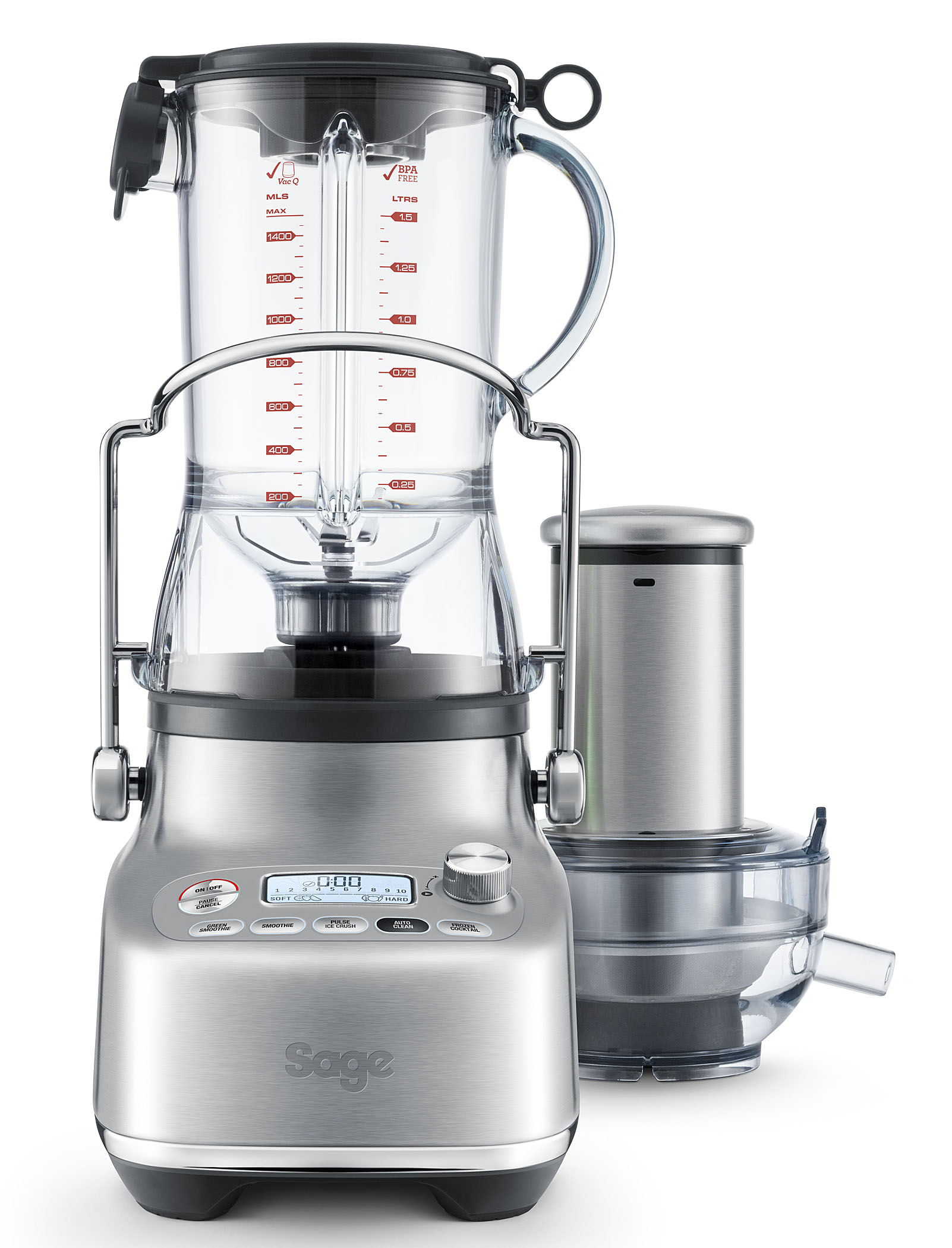 Der Sage Mixer the 3x Bluicer Pro ist eine platzsparende Kombination aus Mixer und Entsafter. Auf den Fuß des Geräts passen verschiedene Aufsätze: ein Einfüllschacht mit einem abnehmbaren Fruchtfleischbehälter zum Entsaften und ein Mixbehälter, der gleichzeitig auch als Saftkanne fungiert. So wird aus dem „Blender“ (Hochleistungsmixer) und „Juicer“ (Entsafter) the 3x Bluicer.