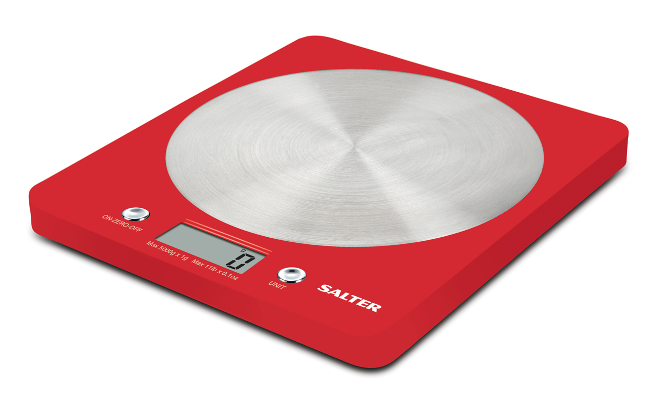 Die Salter Küchenwaage Ultra-slim hat eine praktische Edelstahlplattform. Das Gerät aus der bunten colorweigh-Kollektion gibt es nun in zwei zusätzlichen Farben: Ein kräftiges Rot (1046 RDDR) und ein leuchtendes Blau (1046 BLDR). Sie sind ausgestattet mit Aquatronic-Funktion zum Wiegen von Flüssigkeiten und einer praktischen Zuwiegefunktion. Auch sind