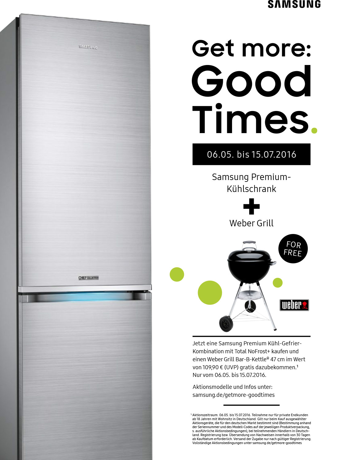 Samsung steigert die Freude auf kulinarische Sommerfeste unter freiem Himmel: Bis 15. Juli 2016 erhalten Kunden beim Kauf ausgewählter Premium Kühl-/Gefrierkombinationen ab sofort zusätzlich einen Weber Kugelgrill im Wert von 109,90 Euro (UVP) gratis dazu. Die Kombination aus frischen Lebensmitteln und idealer Zubereitung verspricht runden Genuss beim Grillfest mit Freunden.