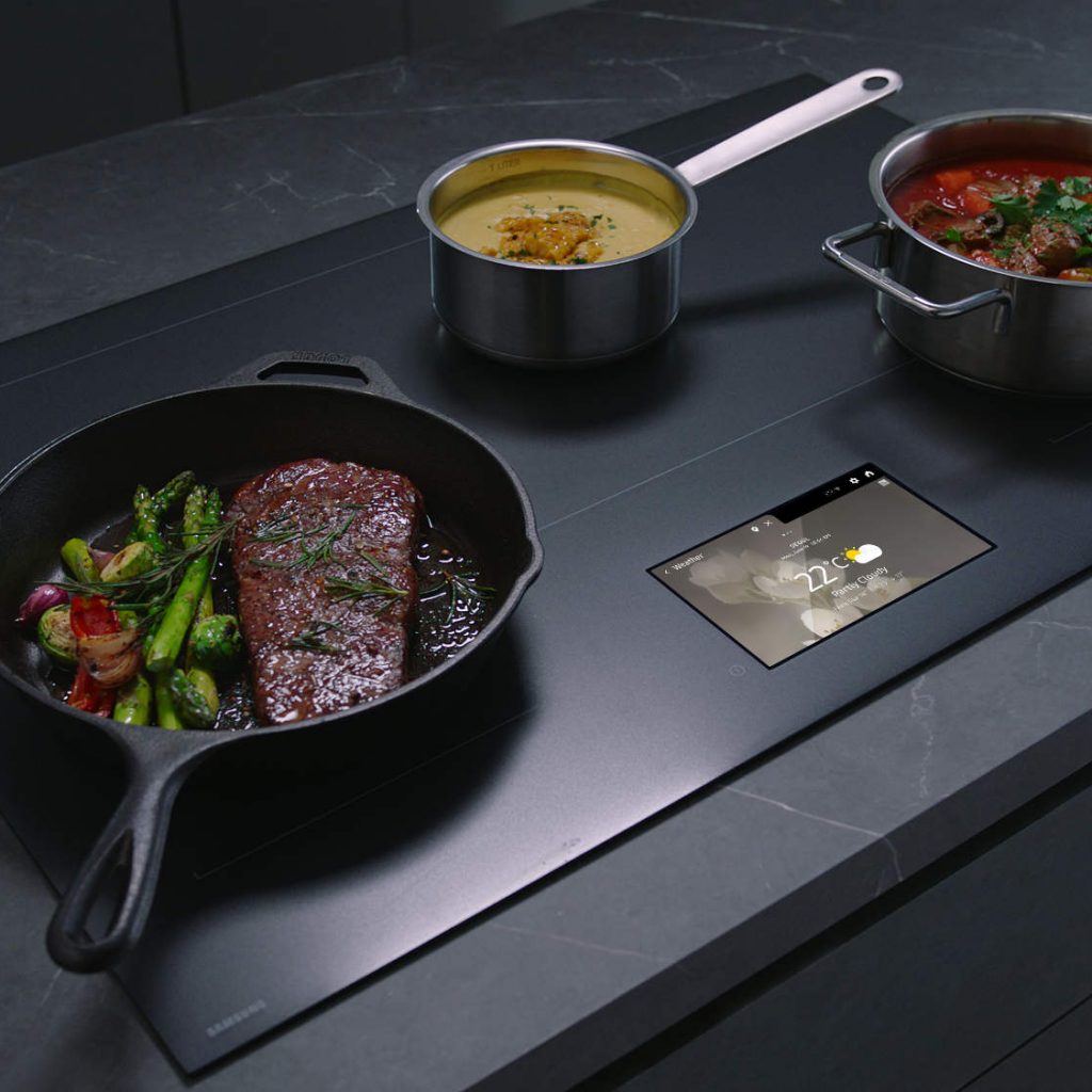 Das intelligente Anyplace Induktionskochfeld, das mit über 70 Sensoren ausgestattet ist, erkennt Töpfe und Pfannen und zeigt ihre Position auf dem ebenfalls integrierten AI Home-Screen an. Durch das smarte 7-Zoll-LCD-Display, erhalten Nutzer*innen die Möglichkeit, ihr SmartThings-Ökosystem im gesamten Haus zu steuern und haben bei Bedarf den Energieverbrauch aller Geräte im Blick. Das Display bietet eine benutzerfreundliche Oberfläche zur Verwaltung aller vernetzten Geräte. Mit AI Home können Rezepte in der Samsung Food App abgerufen und während des Kochens Schritt für Schritt umgesetzt werden.