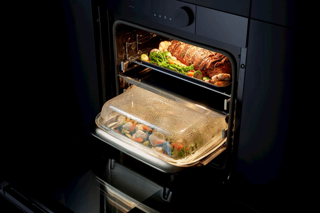 Was beim Nobilia-Rundgang in Verl sofort auffällt: Das gesamte Design der „Infinite“-Linie wird von vertikalen Linien bestimmt. So ist das Blickfenster des Dual Cook Steam im Hochformat gestaltet. Das sorgt für einen eleganten, unaufdringlichen Akzent in der Küche und bringt auch die zubereiteten Speisen enorm zur Geltung. Denn: Der Blick in den Backofen wird durch die Form des Blickfensters auf die Speisen fokussiert.