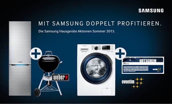Mit zwei Bundle-Aktionen startet Samsung in die Grill- und Festivalsaison. Vom 15. Mai bis 24. Juli 2015 erhalten Samsung Kunden gratis beim Kauf der Waschmaschine WW6000 einen Eventim-Gutschein in Höhe von 75 Euro oder beim Erwerb einer Premium Kühl- und Gefrierkombination aus der neuen Chef Collection einen Weber-Grill im Wert von 100,– Euro dazu.