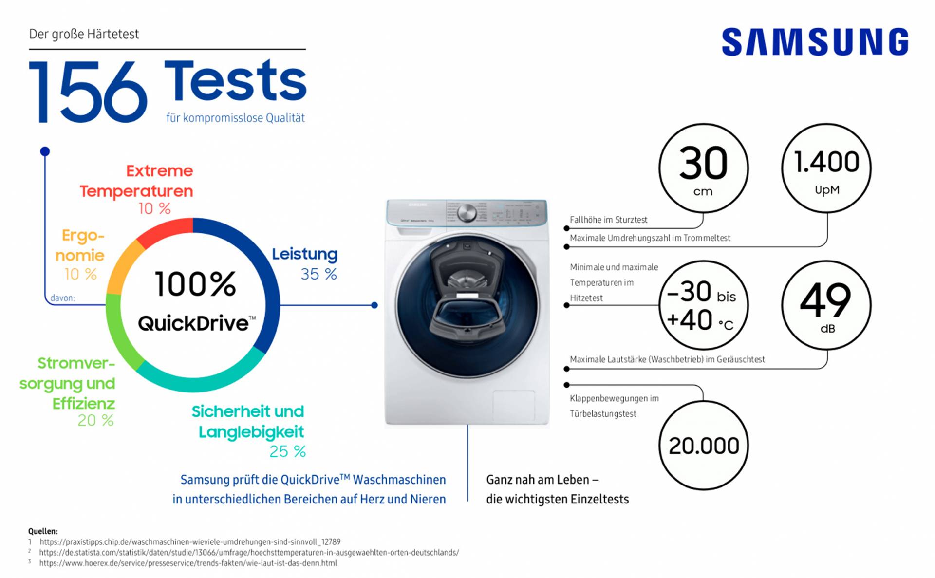 In fünf Bereichen (Extreme Temperaturen, Leistung, Sicherheit und Langlebigkeit, Stromversorgung und Effizienz, Ergonomie) und insgesamt 156 Tests werden QuickDrive und andere Waschmaschinen geprüft. Die wichtigsten Einzeltests: Trommeltest, Hitzetest, Geräuschtest, Türöffnungstest, Ergonomietest.