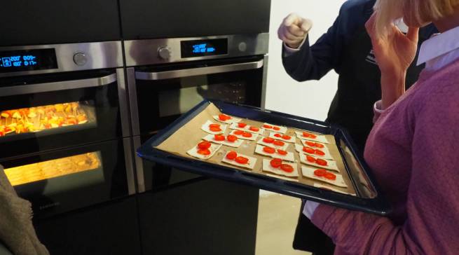 Samsung bietet den Konsumenten ein hierzulande wohl noch nicht dagewesenes Markenerlebnis an, bei dem klar die Interaktion mit Technik im Mittelpunkt steht. Und so gab es beim Roundtable natürlich Kochschürzen für alle, um den zur letzten IFA vorgestellten Dual Cook Flex Backofen mit zweigeteilter Ofentür und teilbarem Garraum auszuprobieren. Dank zwei Heißluftventilatoren lassen sich zwei unterschiedliche Gerichte ohne Geruchs- und Geschmacksübertragung zur gleichen Zeit zubereiten. Der Clou: durch eine geteilte Tür kann der Ofen vollständig oder lediglich die obere Hälfte geöffnet werden – so kann die Hitze des unteren Garraums nicht entweichen und damit verbundener Energieverlust vermieden werden. Das war Markenerlebnis pur!