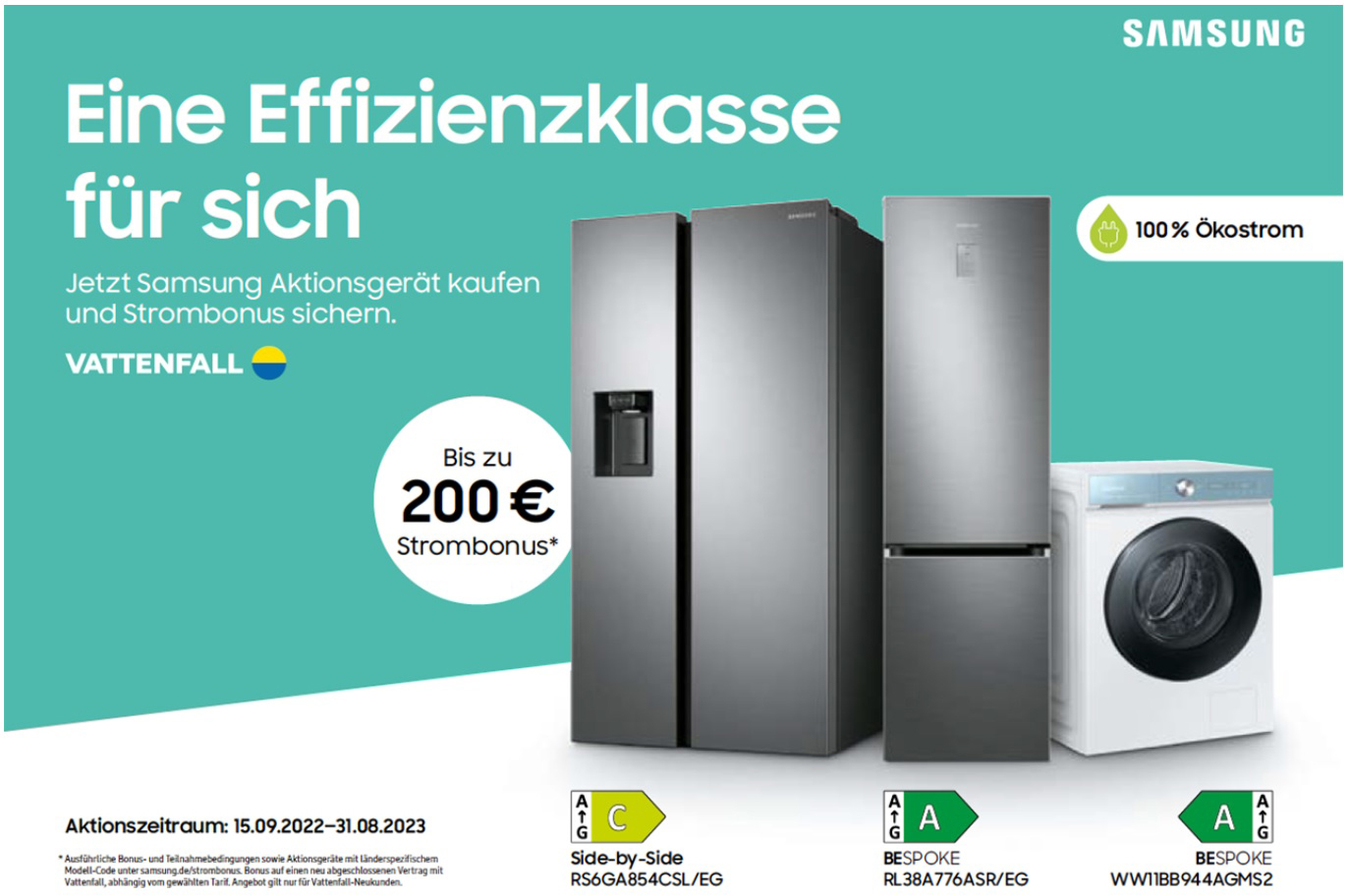 Unter dem Motto „Eine Effizienzklasse für sich“ bietet Samsung in Kooperation mit Vattenfall ein Aktionspaket, bei dem Käufer einen Strombonus von bis zu 200 EUR erhalten können.