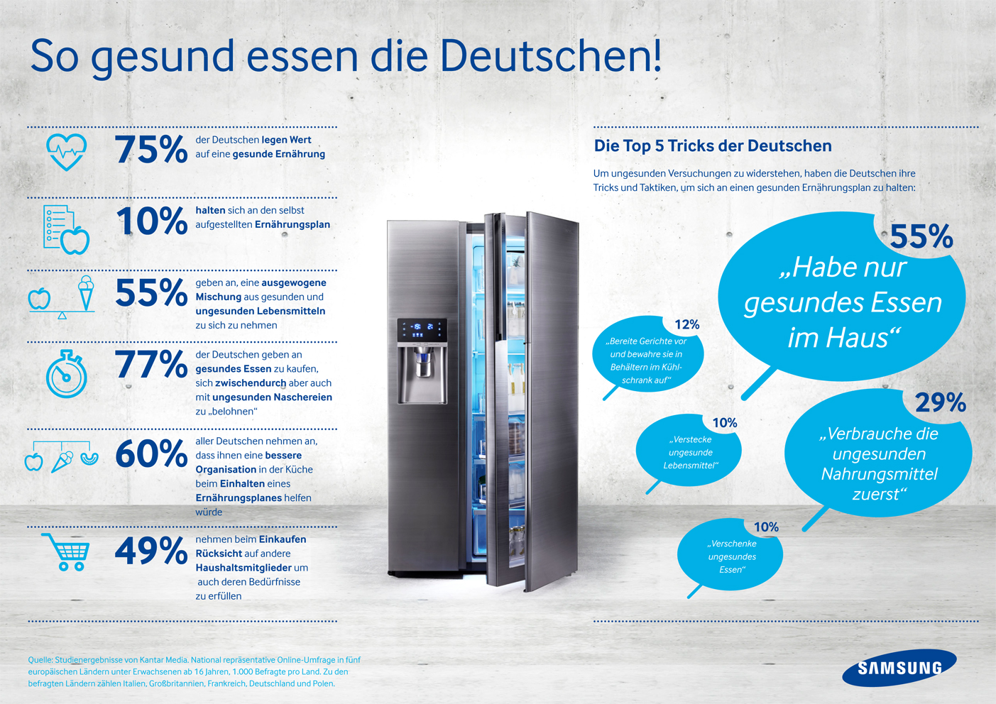 Dreiviertel der Deutschen versuchen, sich gesund zu ernähren. Trotzdem schafft es nur jeder Zehnte, sich an den selbst aufgestellten Ernährungsplan zu halten. Dieses Ergebnis geht aus dem „Samsung Healthy Eating Report“ hervor, einer unabhängigen Studie* von Kantar Media, die das Ernährungsverhalten von fünf europäischen Nationen genauer unter die Lupe nimmt. Im Mittelpunkt der Studie steht der neue Samsung Food Showcase – ein Kühlschrank, von Grund auf neu durchdacht.