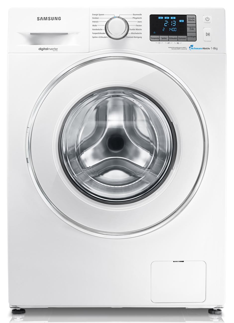 Die Samsung WF-80F5E Waschmaschine sorgt mit Schaum Aktiv-Technologie für optimale Waschergebnisse, auch bei starken Verschmutzungen und empfindlichen Textilien. Die Schaum Aktiv-Technologie kombiniert gute Waschleistung mit Energieeffizienz. Sie wäscht mit niedrigen Wassertemperaturen und löst das Waschmittel zu Beginn des Waschgangs mittels Luft und Wasser in feinporigen Schaum auf, der schneller und gleichmäßiger in die Textilien eindringt. Auf diese Weise wird die Kleidung auch bei Temperaturen ab 20 Grad besonders gründlich und energieschonend gereinigt, so der Hersteller. Das separat zuschaltbare Fleckenprogramm reinigt Tee, Wein und Gras.