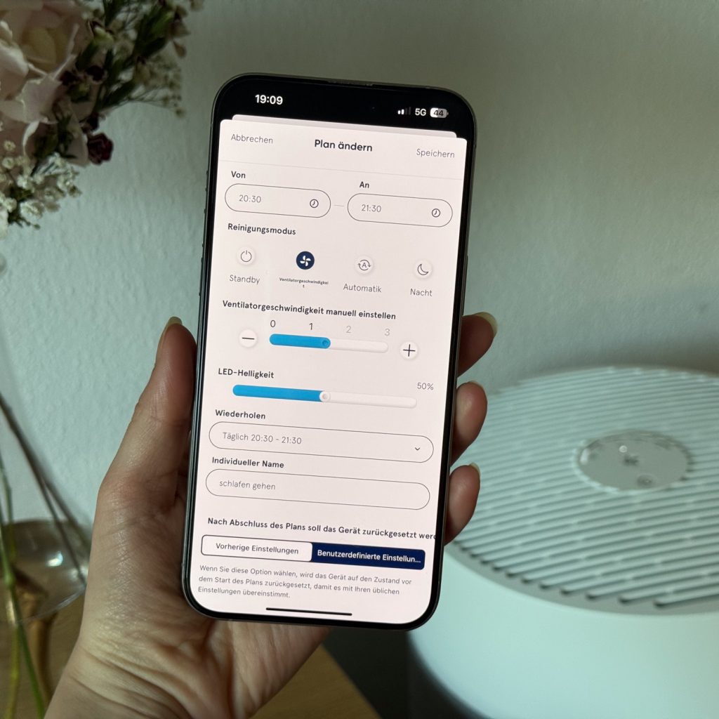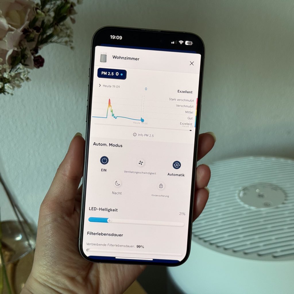 Besonders im Alltag hilfreich: Der integrierte PM2.5-Sensor misst permanent die Luftbelastung und regelt die Lüftergeschwindigkeit automatisch. Wenn beim Staubsaugen Staub aufgewirbelt wird, höre ich den Lüfter leise hochdrehen – nach ein paar Minuten kehrt wieder Ruhe ein. Auch der Nachtmodus ist ein Segen: Mit nur 23 dB läuft der Luftreiniger quasi lautlos, die Beleuchtung dimmt automatisch herunter.