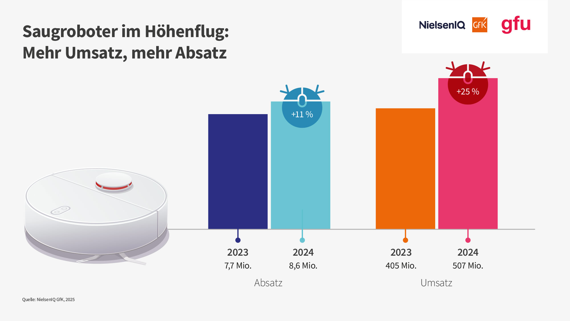 Dass sich diese Vorteile auch in den Umsatz- und Absatzzahlen widerspiegeln, ist daher erwartbar. Entsprechend wächst der Markt für Saugroboter weiter. Laut NIQ/GfK wurden in Deutschland 2024 ca. 850.000 mehr Geräte verkauft – ein Zuwachs von fast 11% gegenüber dem Vorjahr. Besonders dynamisch entwickelt sich der Umsatz: Der stieg um etwas mehr als 25% auf 507 Mio. EUR (2023: 405 Mio. EUR).