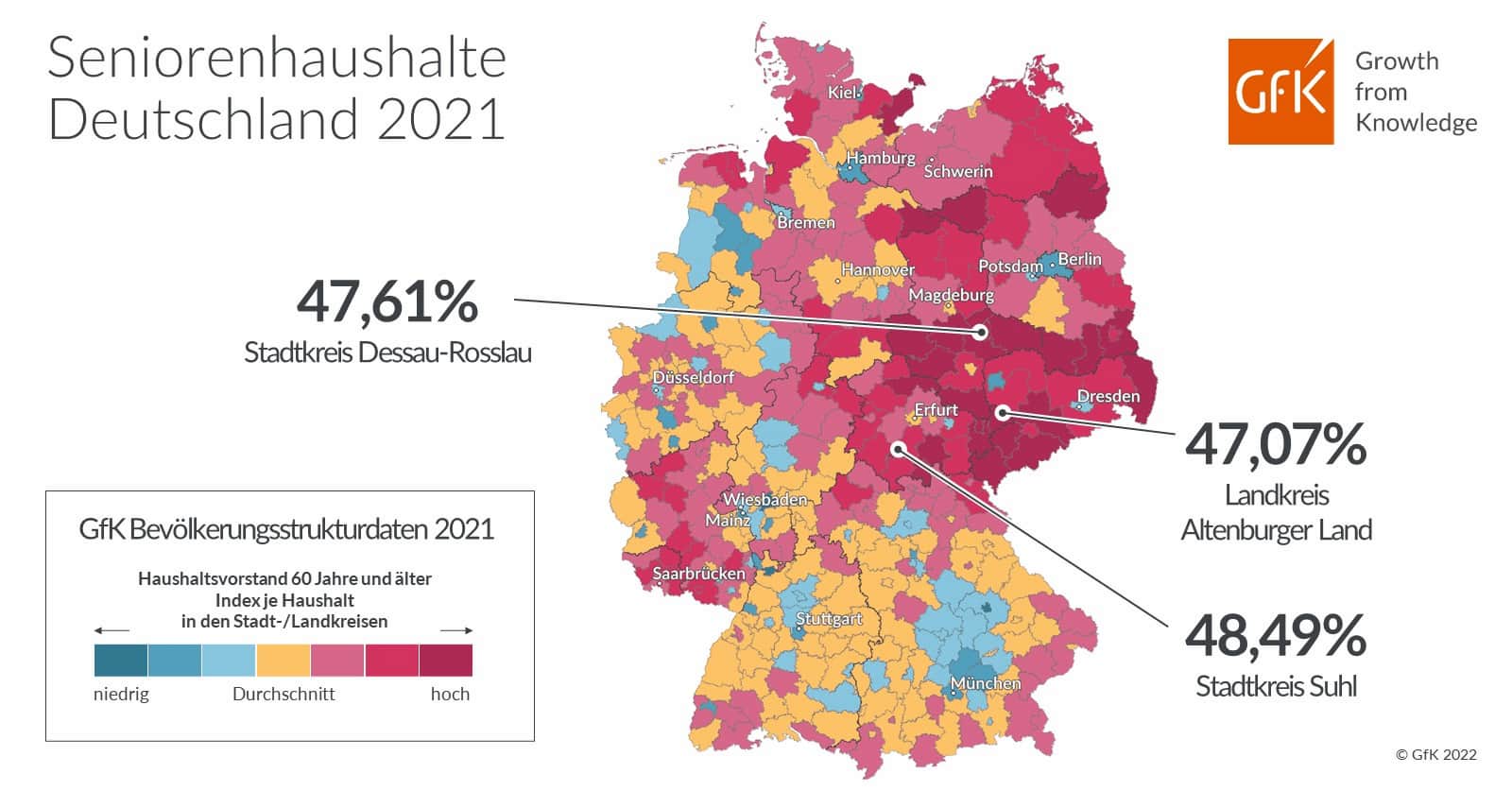 Laut der aktuellen-Studie der Gesellschaft für Konsumforschung (GfK) zu den Bevölkerungsstrukturdaten für Deutschland ist der Anteil an Haushalten, in denen der Hauptverdiener 60 Jahre oder älter ist, in ländlichen Gebieten und vor allem im Osten am höchsten.