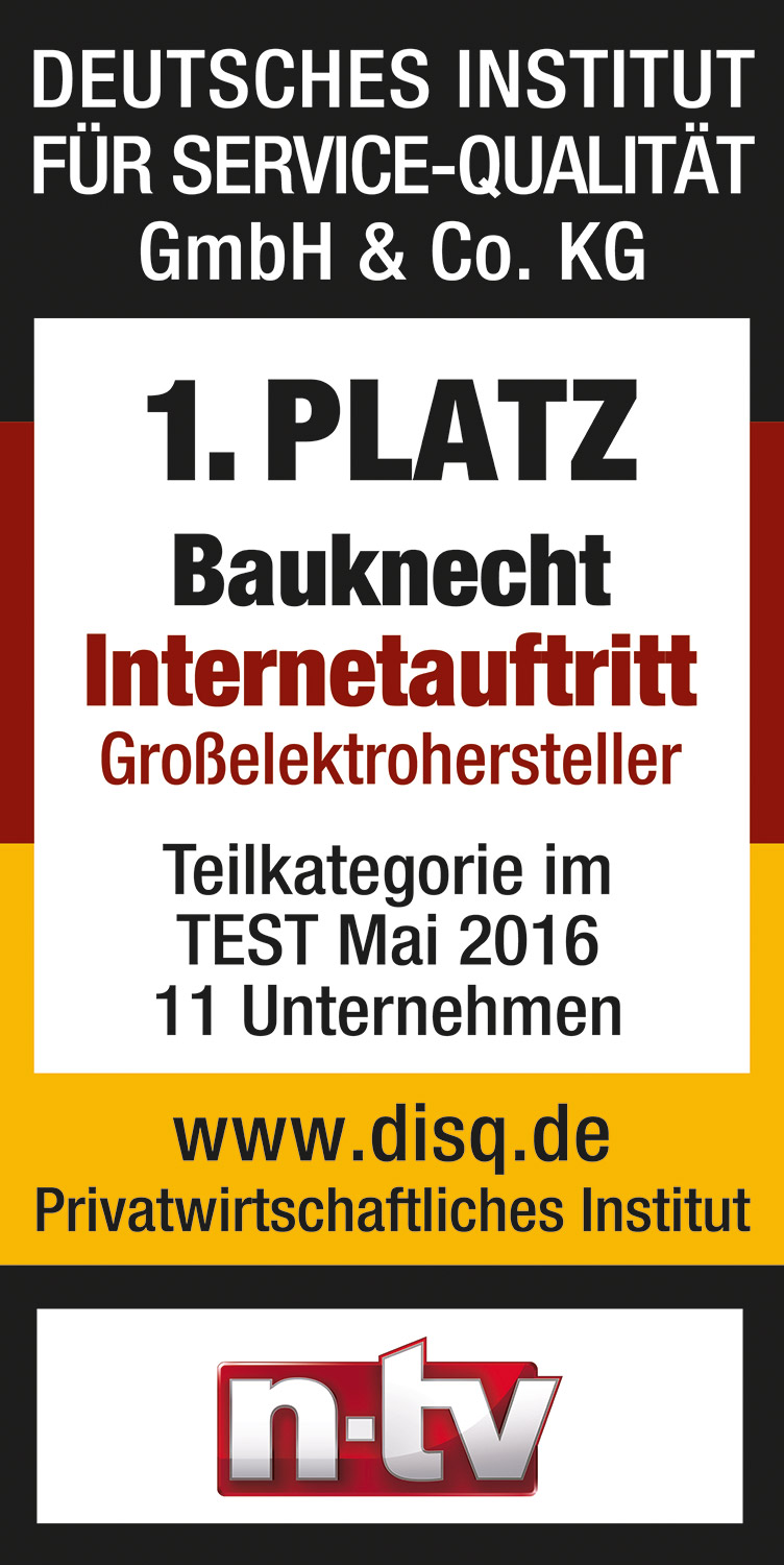 Im Rahmen der Studie „Großelektrohersteller 2016“ stellte das DISQ von Januar bis April 2016 die Servicequalität von elf Großelektroherstellern auf den Prüfstand. Nach insgesamt mehr als 300 Servicekontakten per E-Mail und per Telefon beurteilten die Testkunden den Support und die Beratungsqualität und wählten Bauknecht so unter die Top 3 aller getesteten Anbieter. Darüber hinaus analysierten geschulte Nutzer Inhalte und Anwenderfreundlichkeit der Unternehmens-Webseiten.