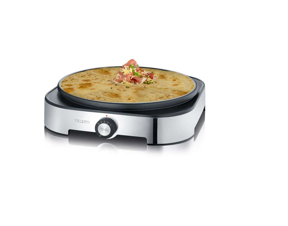 Mit dem Severin Crêpes Maker CM 9469 sind Teigspezialitäten wie Crêpes, Galettes, Tortillas und auch Pancakes schnell und komfortabel zubereitet. Er überzeugt mit seiner XXL-Grillplatte und einem stufenlosen Soft-Touch-Temperaturregler zur gewünschten Anpassung des Bräunungsgrades. Zudem besticht der Crêpes-Maker CM 9469 durch sein zeitloses Design aus Edelstahl. Die Antihaftbeschichtung der abnehmbaren Grillplatte verhindert das Festkleben von Teig und ermöglicht eine einfache Reinigung. Ausgestattet mit einem Teigspatel sowie einem Crêpeswender aus Holz garantiert er eine einfache Handhabung. Als Jubiläumsvariante glänzt der Crêpes Maker CM 9469 mit einem zusätzlichen On-Pack: Mit den vier beigefügten Silikon-Ringen gelingen formschöne Mini-Crêpes, -Spiegeleier oder –Pancakes.