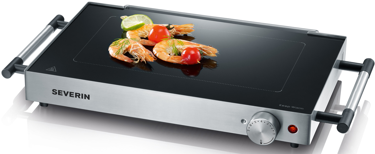 Der Severin Design-Glasgrill KG 2385 bietet eine strapazierfähige 27,5 x 23 cm große Glasgrillfläche für Fisch, Fleisch, Geflügel oder Gemüse. Das Prinzip folgt der japanischen Tradition des Teppanyaki – die Gerichte werden auf einer meist portablen Heizplatte direkt bei Tisch zubereitet. Das robuste Edelstahlgehäuse und die Cool-Touch-Griffe sorgen für hohe Standfestigkeit und unproblematisches Grillen. Speisen, die nicht gleich zum Verzehr kommen, lassen sich auf der umlaufenden Warmhaltezone abstellen.